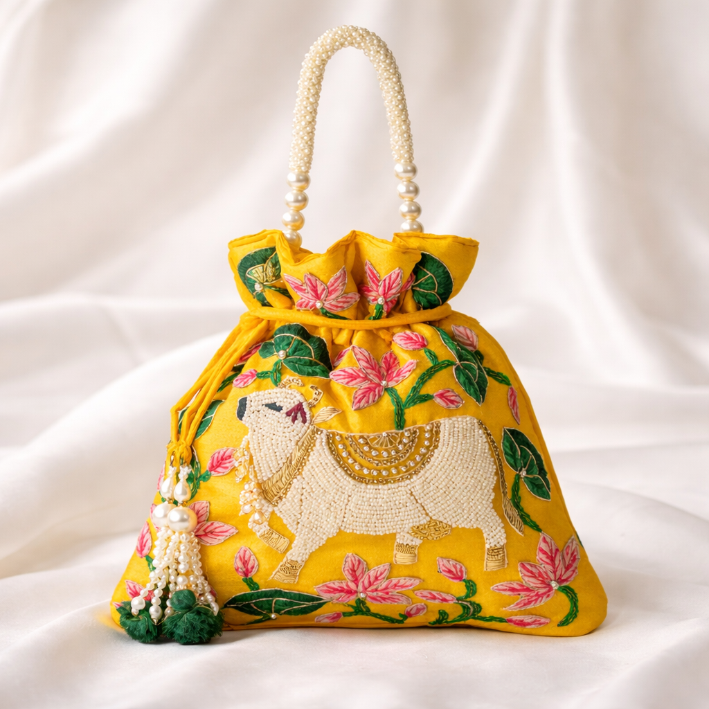 Yellow Lotus Cow Embroidered Potli