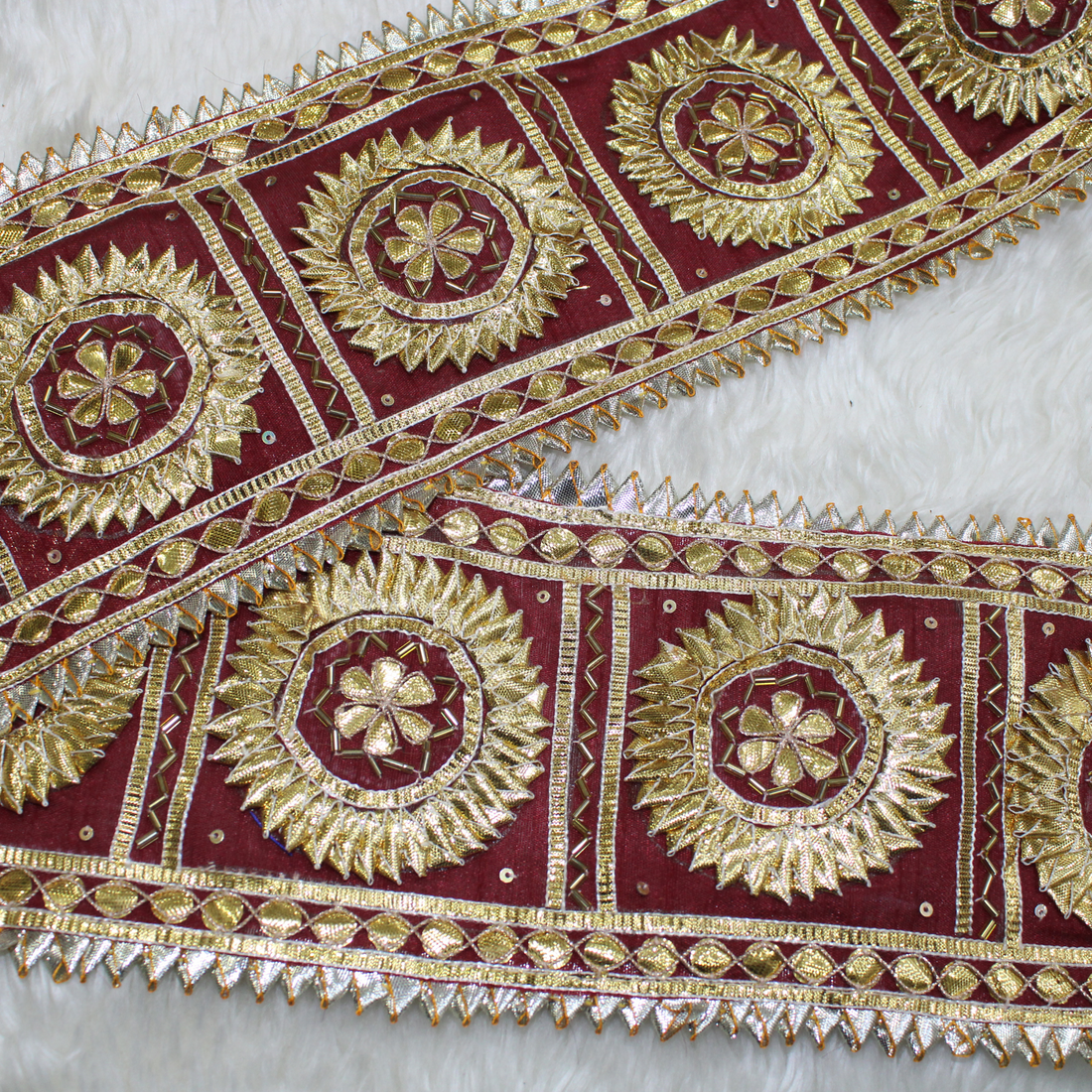 This premium lace trim features intricate floral patterns crafted in shimmering zari work. The detailed...