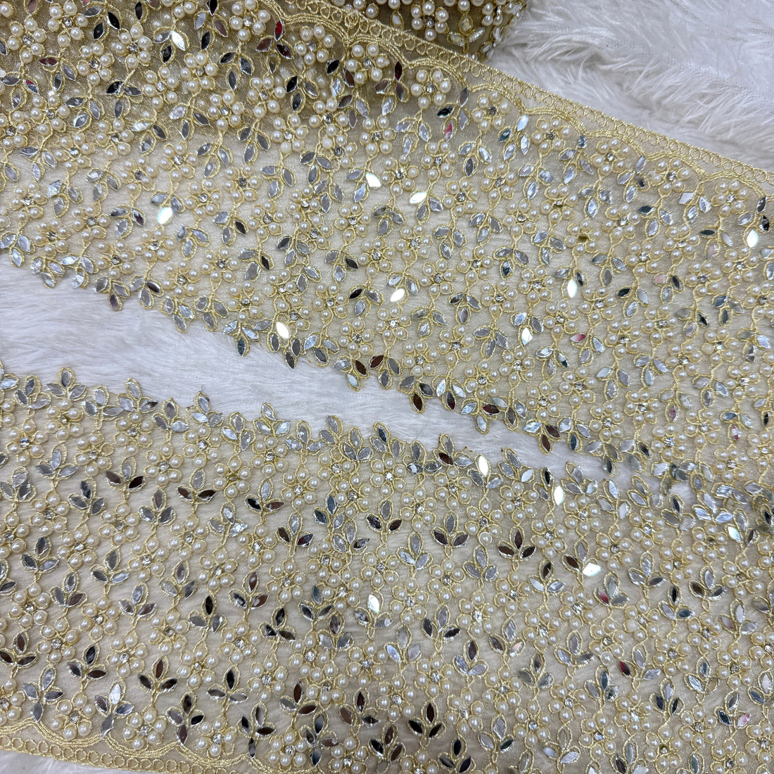 Premium mirror and pearl embroidered lace border designed to elevate sarees, lehengas, blouses, dupattas, and...