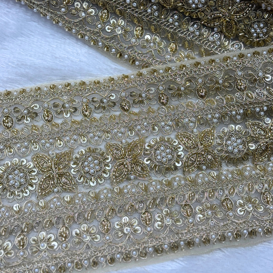 Elegant pearl and sequin embroidered designer lace border crafted to enhance sarees, lehengas, dupattas, blouses,...