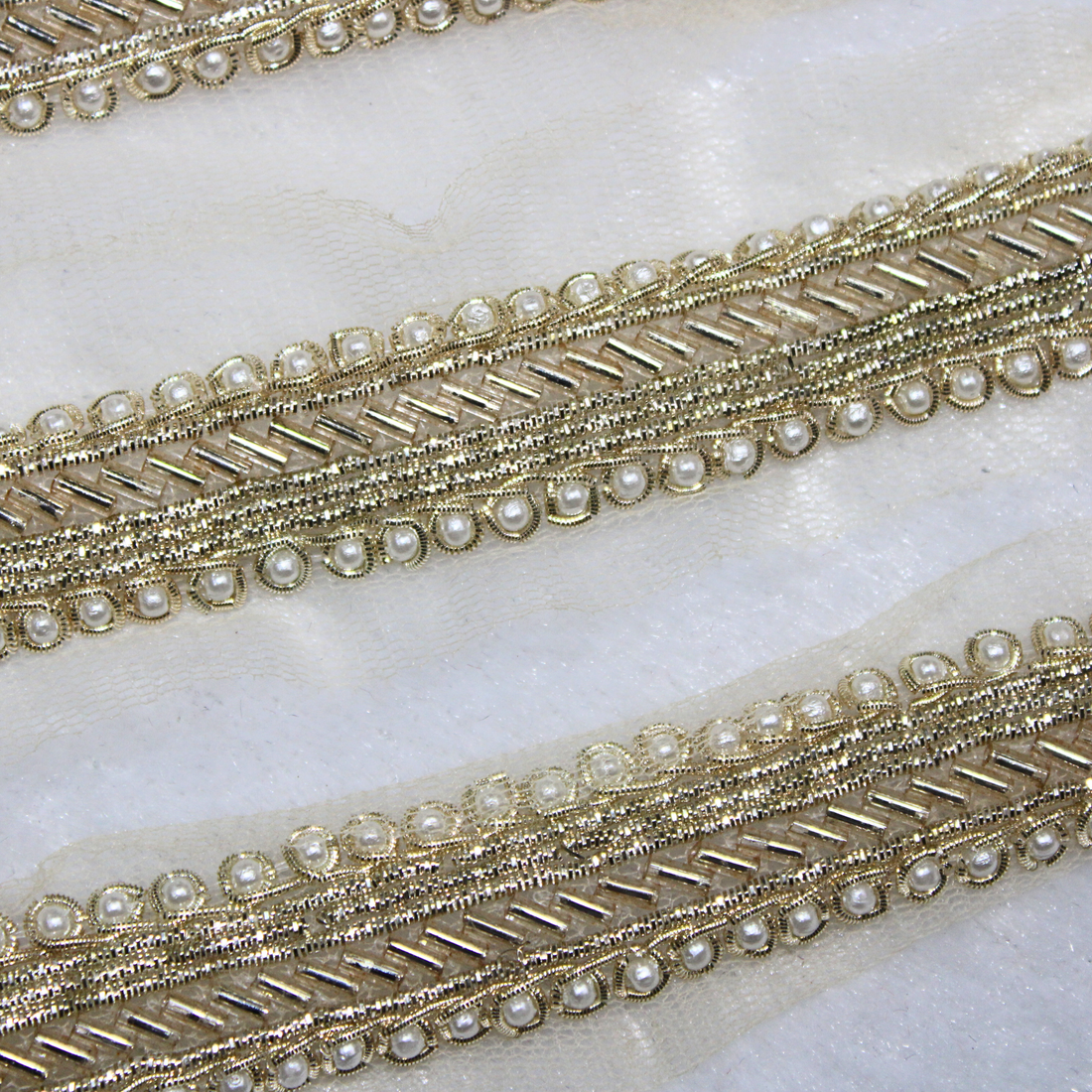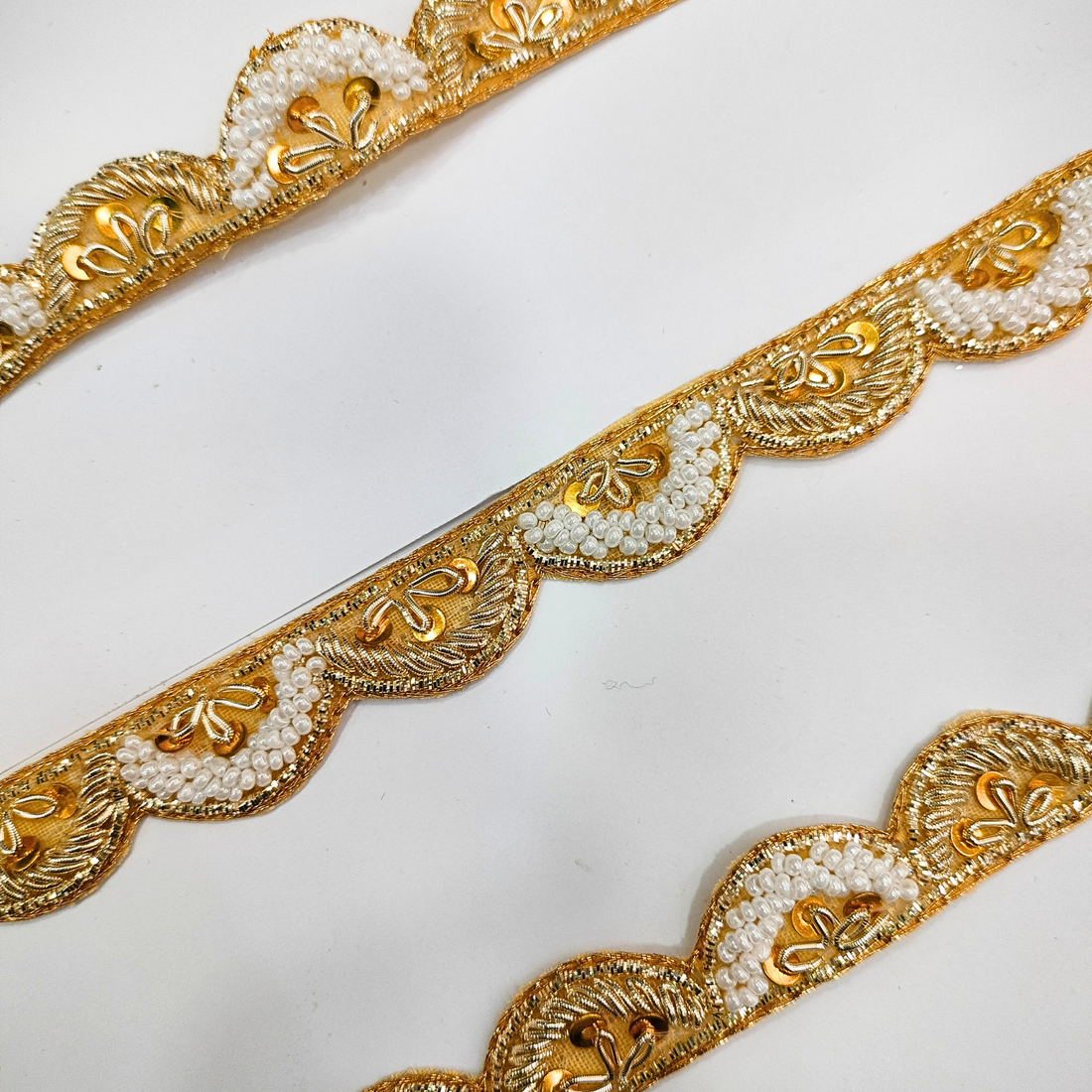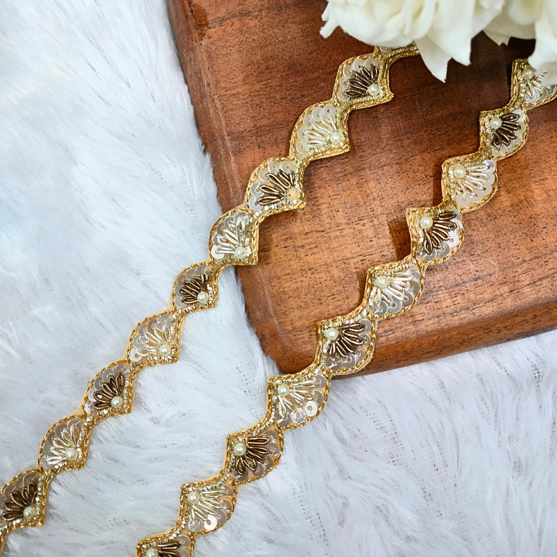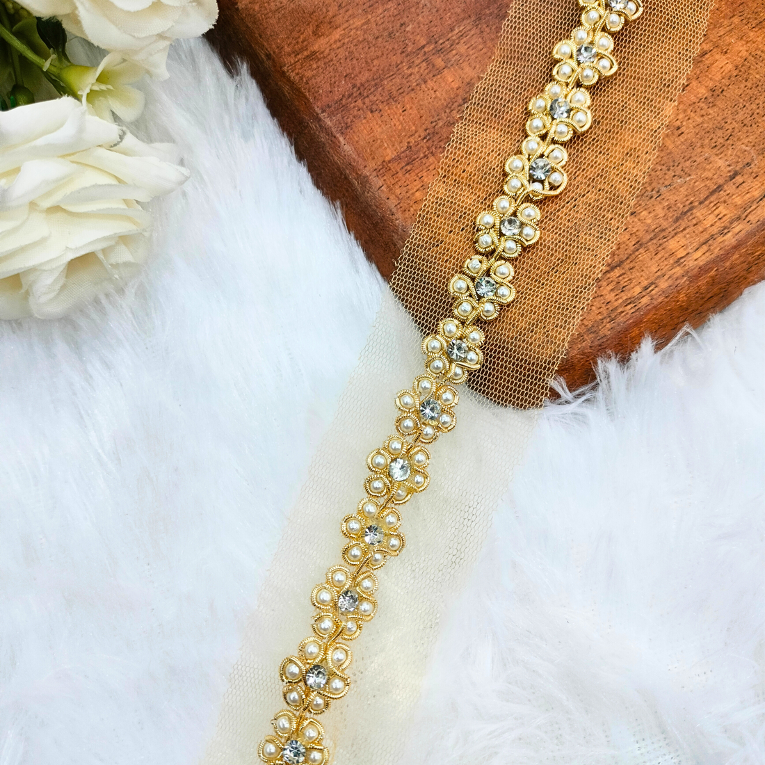 Golden and White Pearl and Stone Embellished Handwork Lace