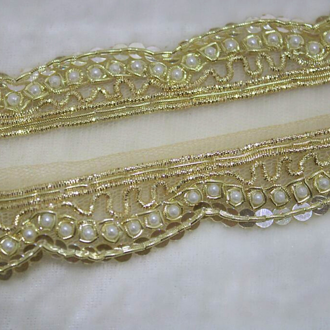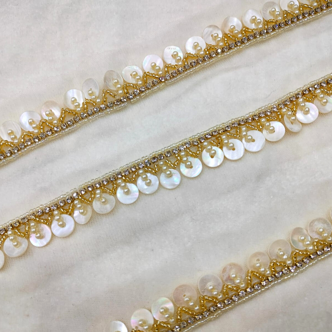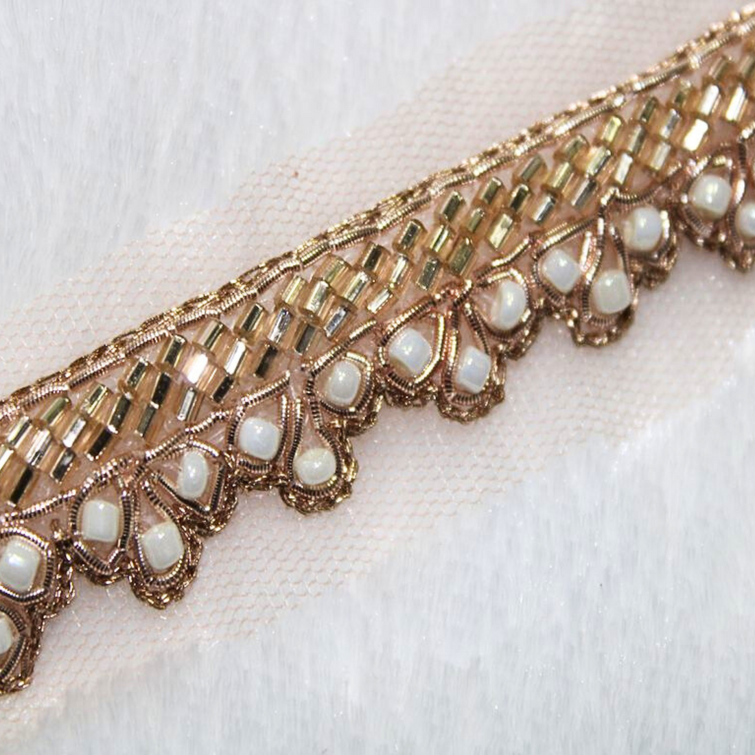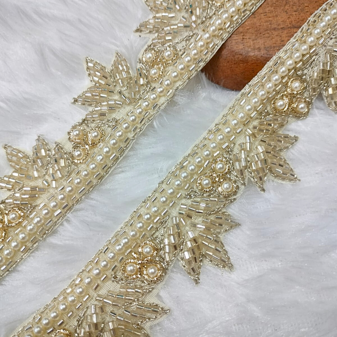 Golden and White Pearl and Stone Embellished Handwork Lace