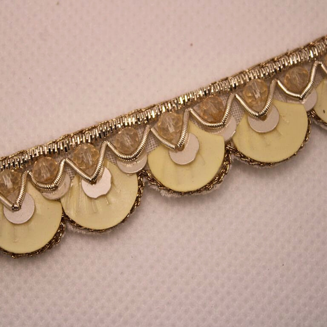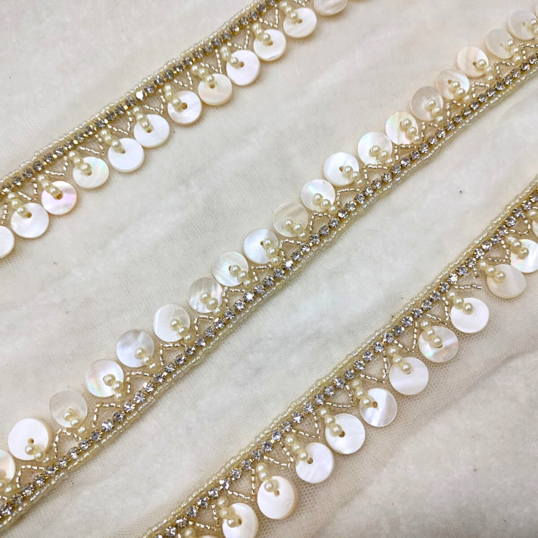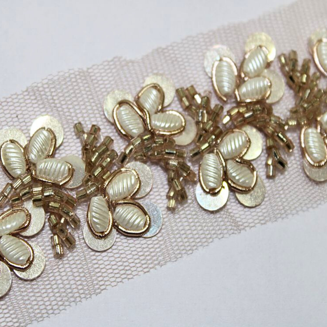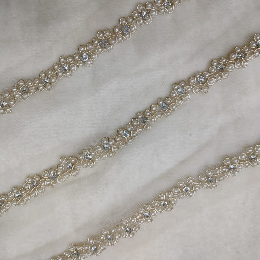 Golden and White Pearl and Stone Embellished Handwork Lace