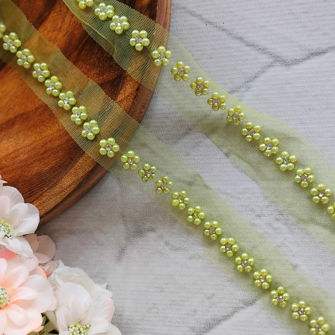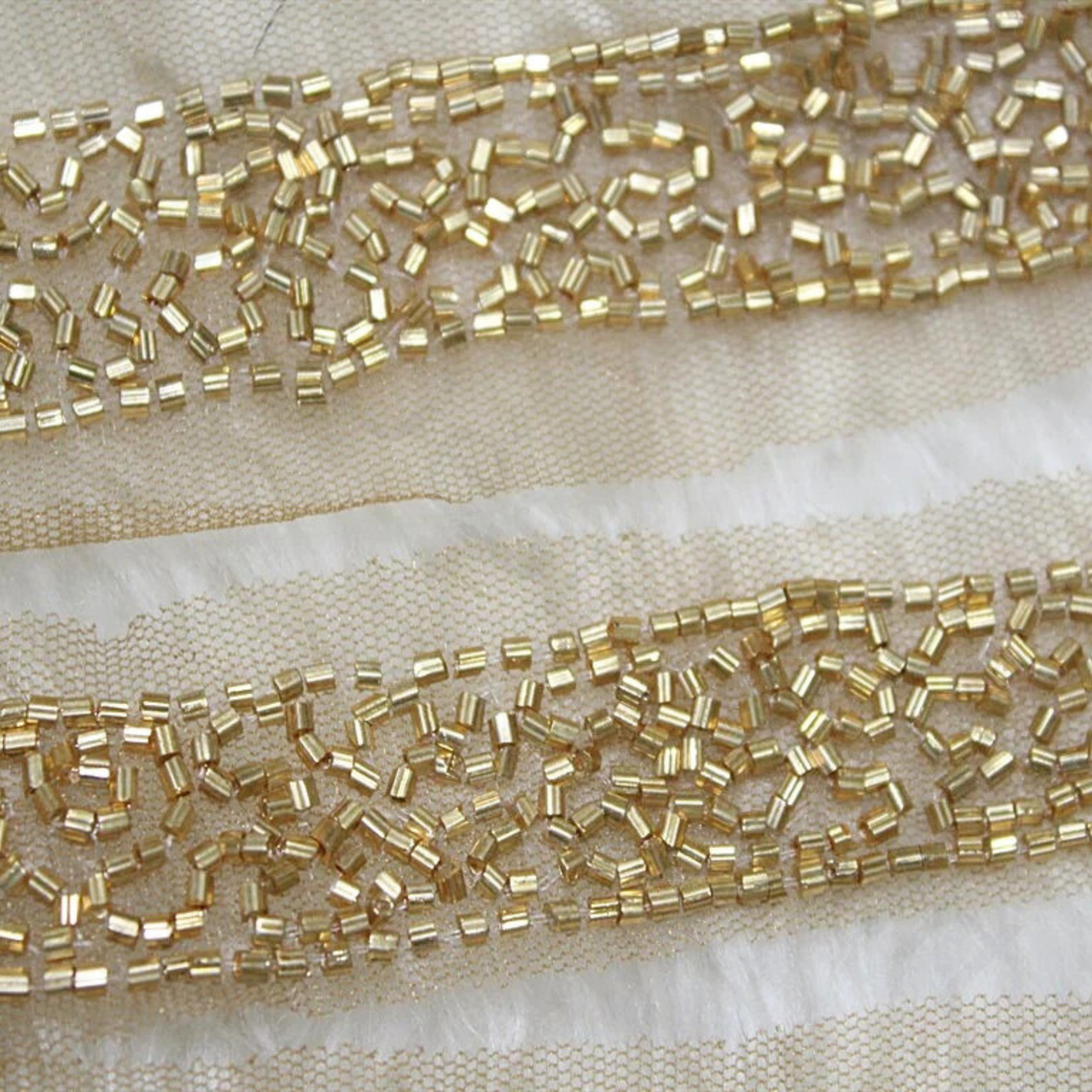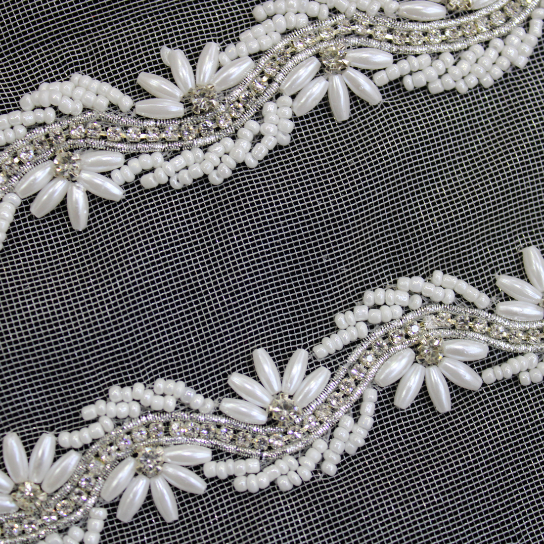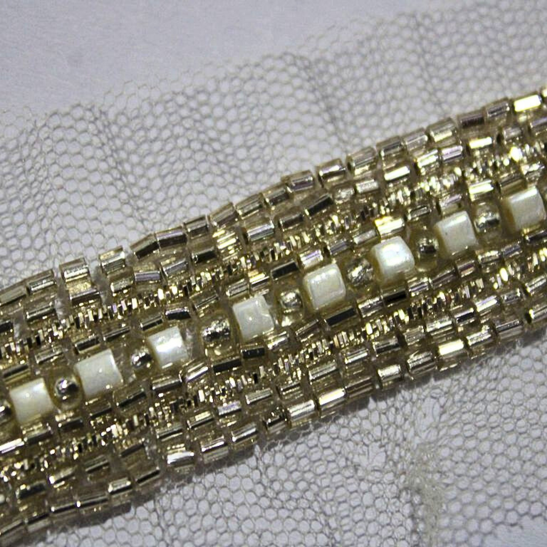 Golden and White Pearl and Stone Embellished Handwork Lace
