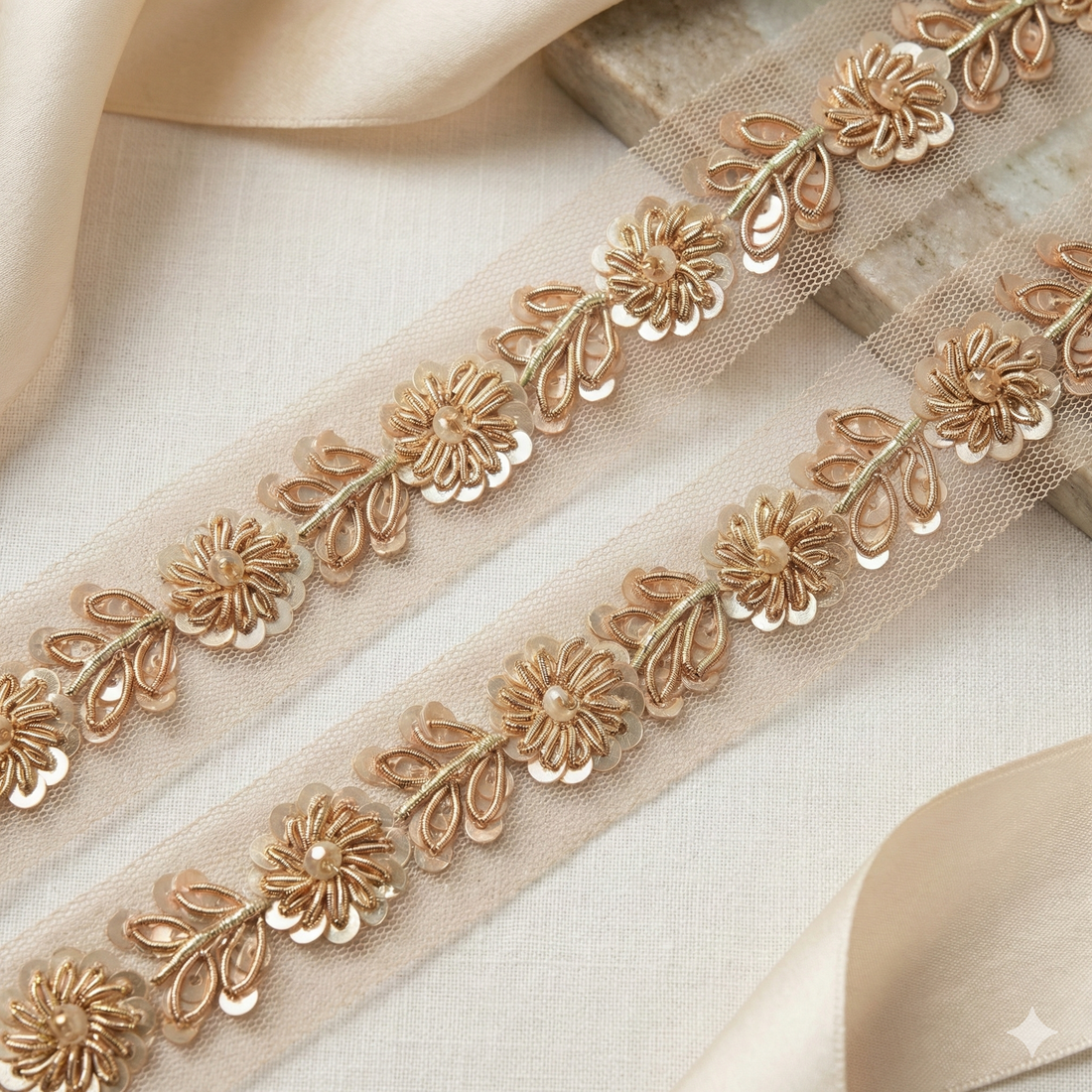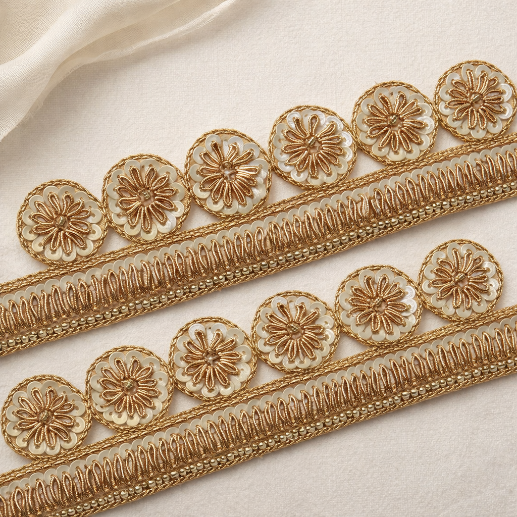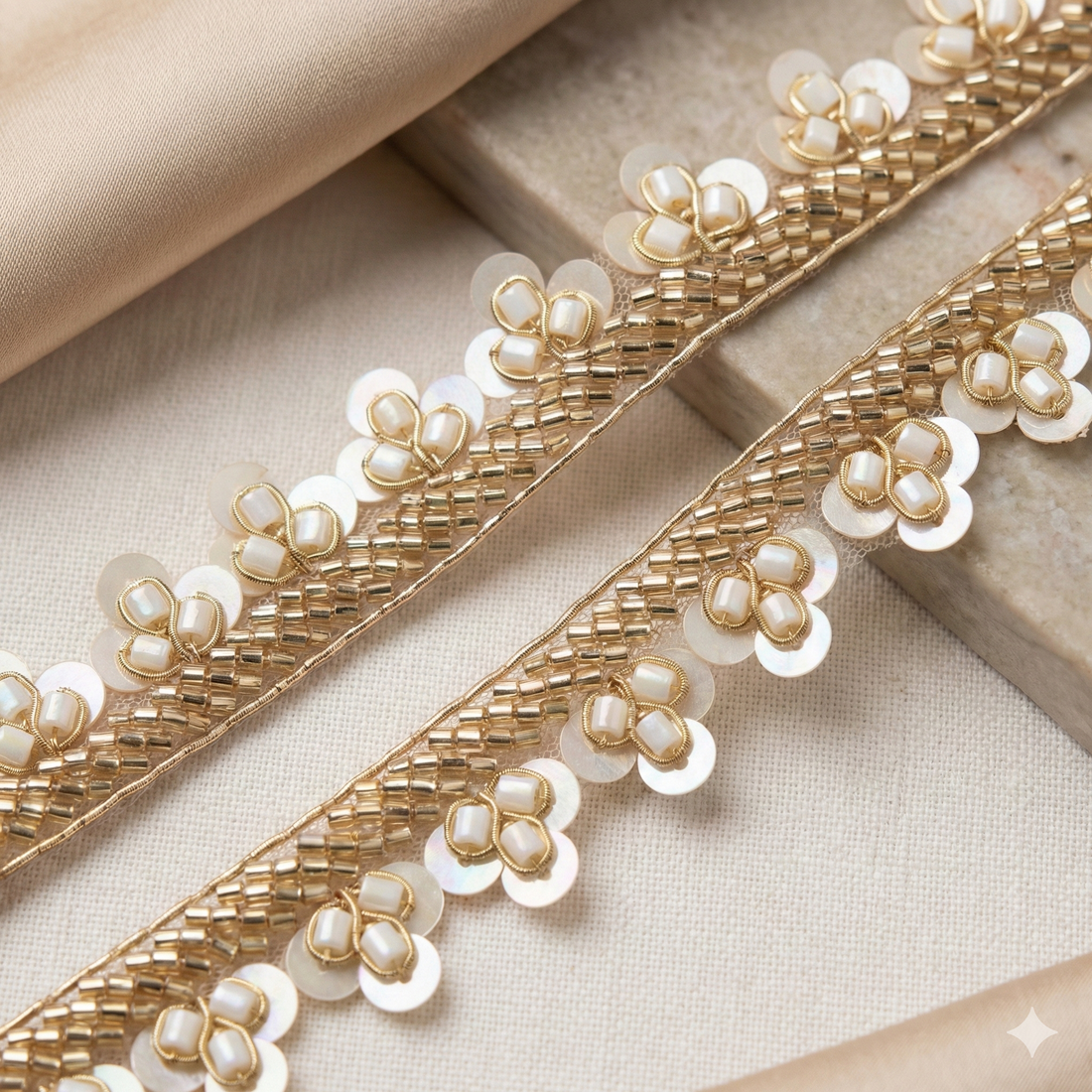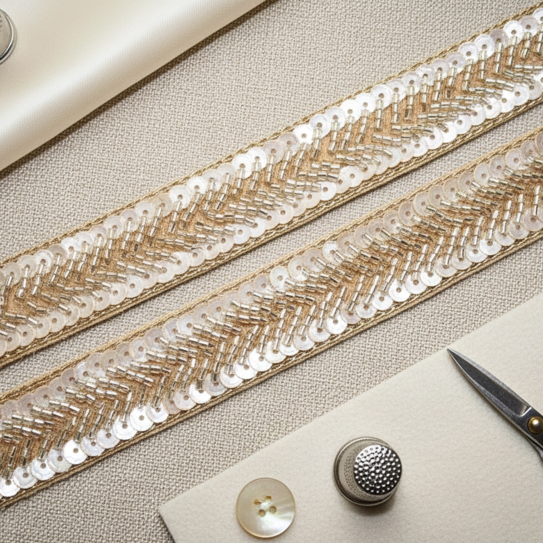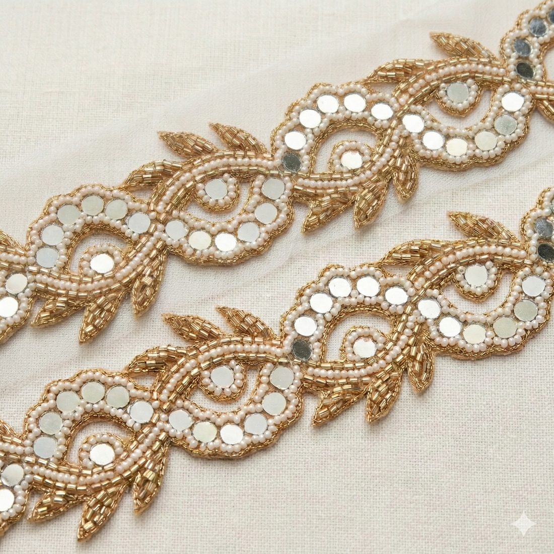 One of the most loved types of trims is handcrafted trims—made with skill, tradition, and passion. These are not just any trims. They are carefully crafted by artisans who pour years of expertise into their work. Zari handwork trims, for example, are crafted using gold or silver threads to create intricate, shimmering patterns that are simply mesmerizing. Other handcrafted trims might include mirror work, embroidery, or even delicate beadwork, each made by hand to ensure precision and uniqueness.