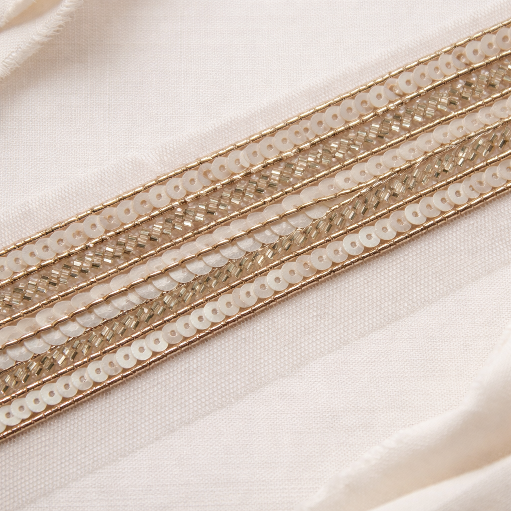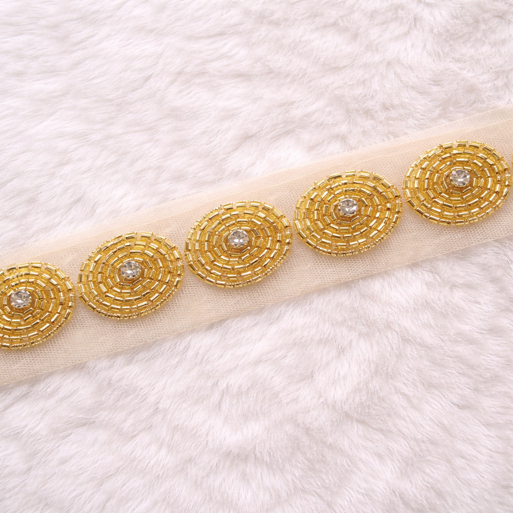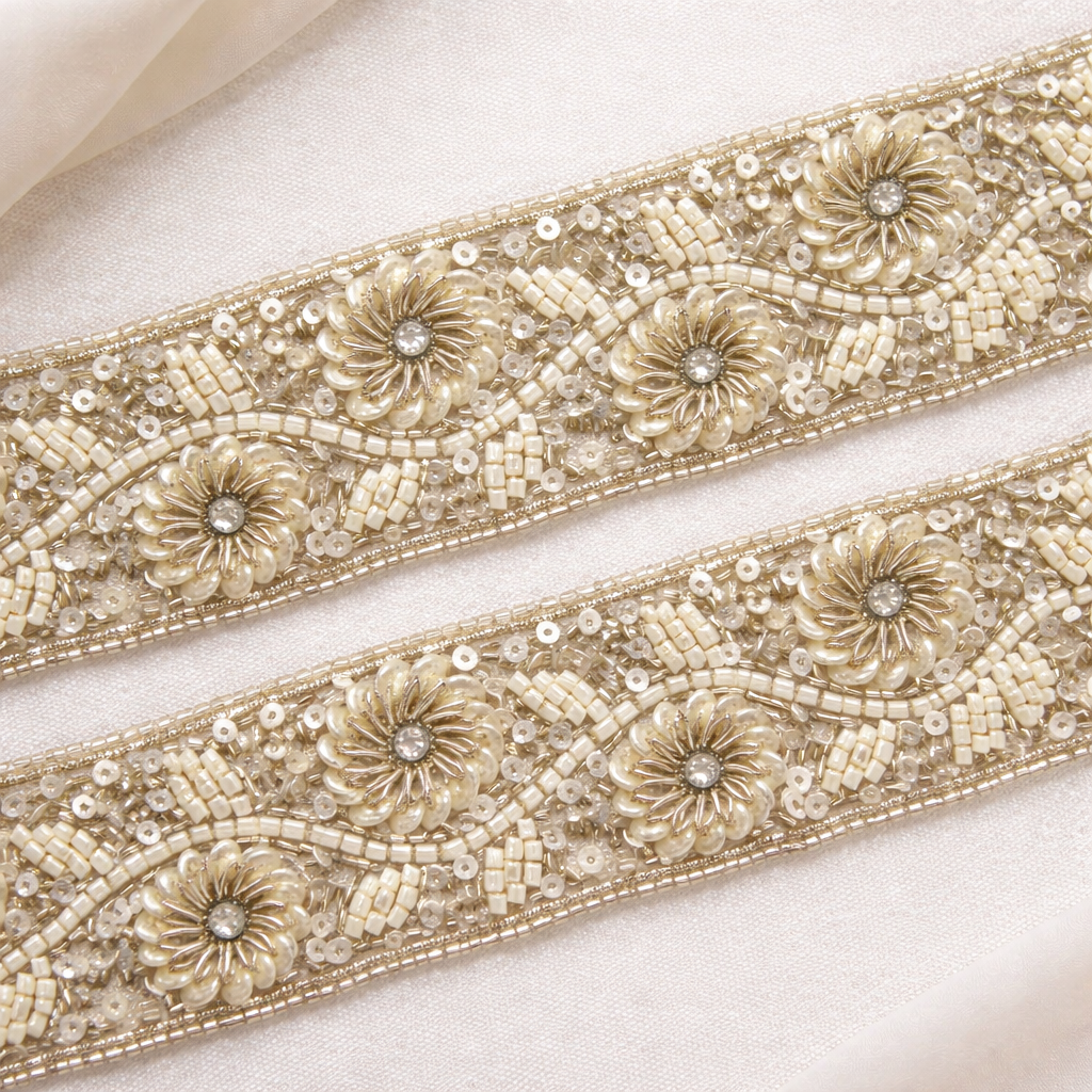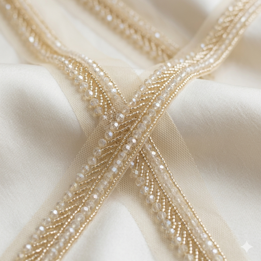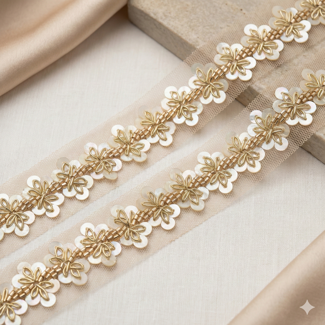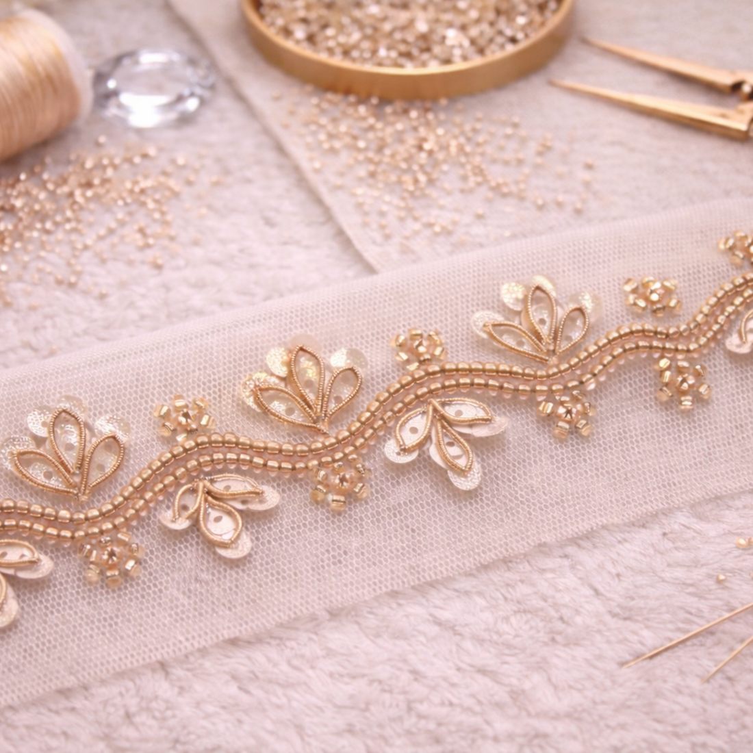 One of the most loved types of trims is handcrafted trims—made with skill, tradition, and passion. These are not just any trims. They are carefully crafted by artisans who pour years of expertise into their work. Zari handwork trims, for example, are crafted using gold or silver threads to create intricate, shimmering patterns that are simply mesmerizing. Other handcrafted trims might include mirror work, embroidery, or even delicate beadwork, each made by hand to ensure precision and uniqueness.
