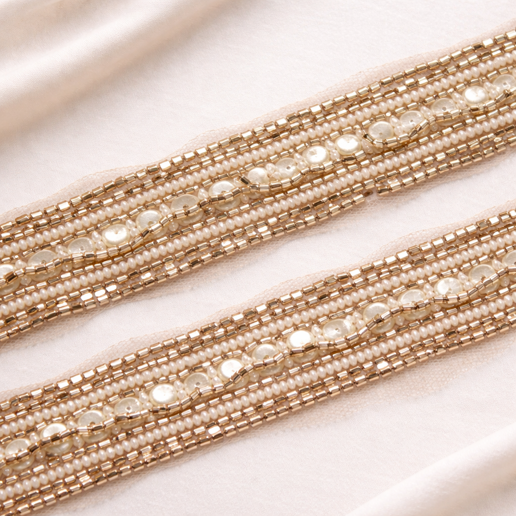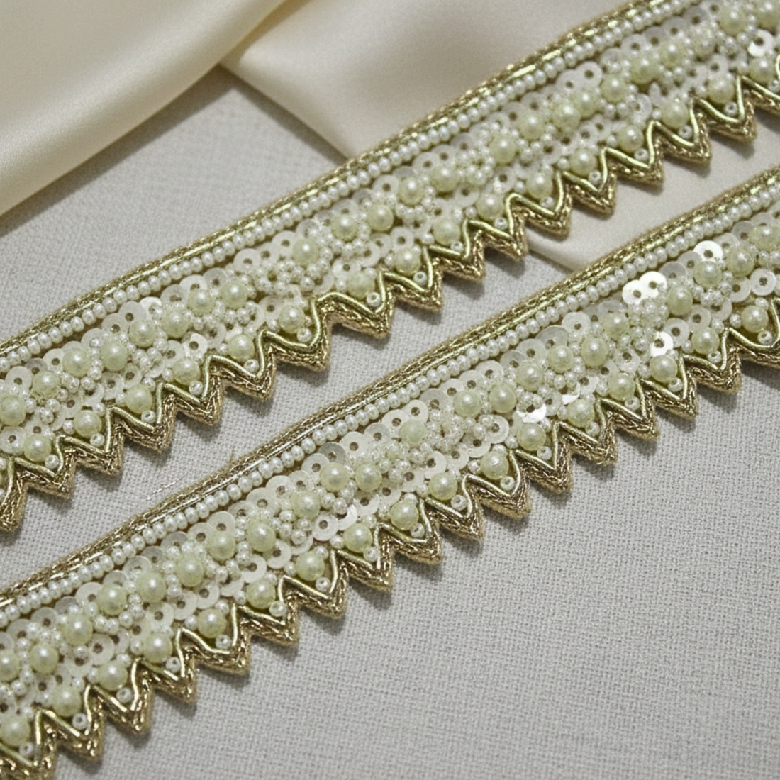 Golden Shimmer With White Pearl Embroidered Handwork Lace