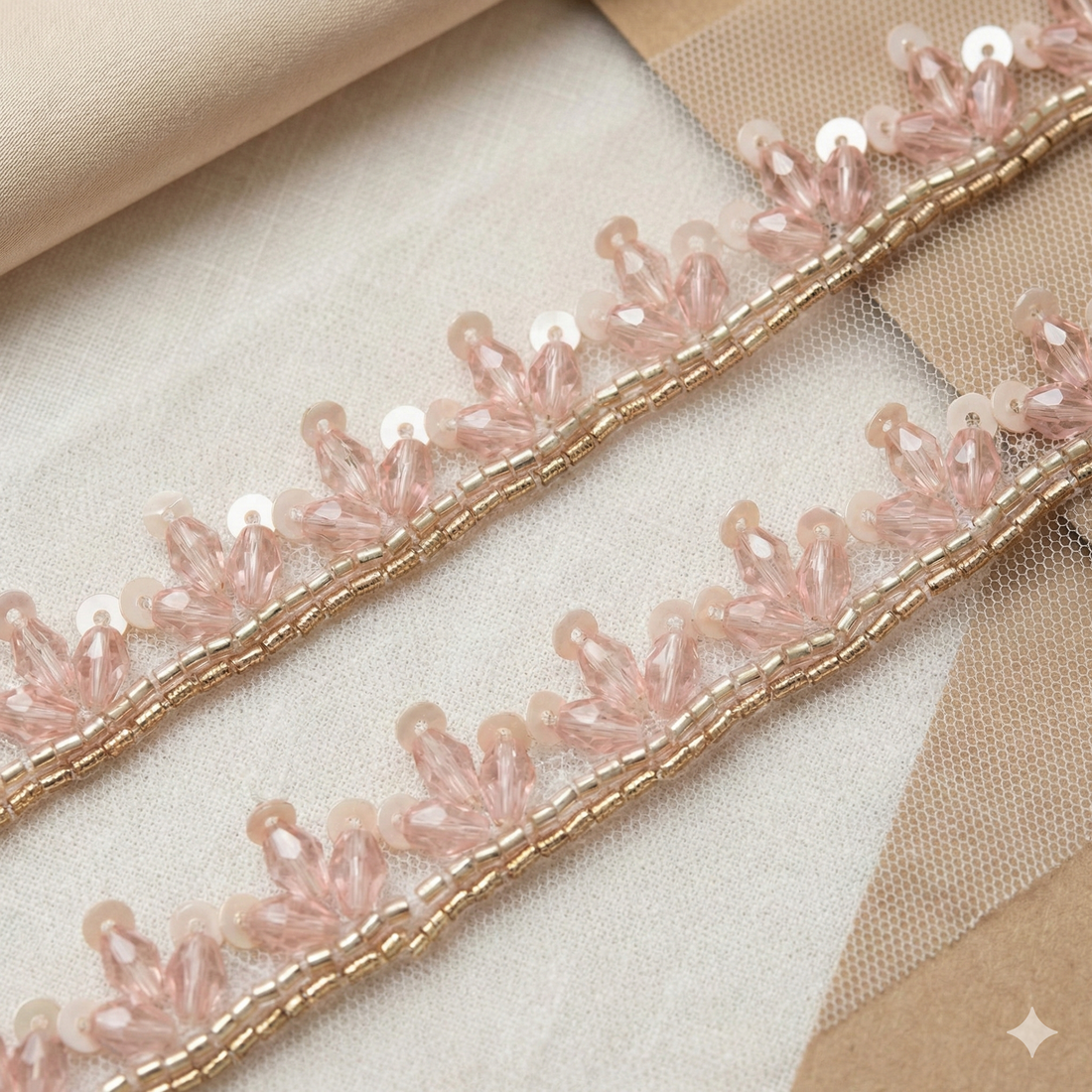 Rose Gold Shimmer and Light Pink Crystal Handwork Lace Border