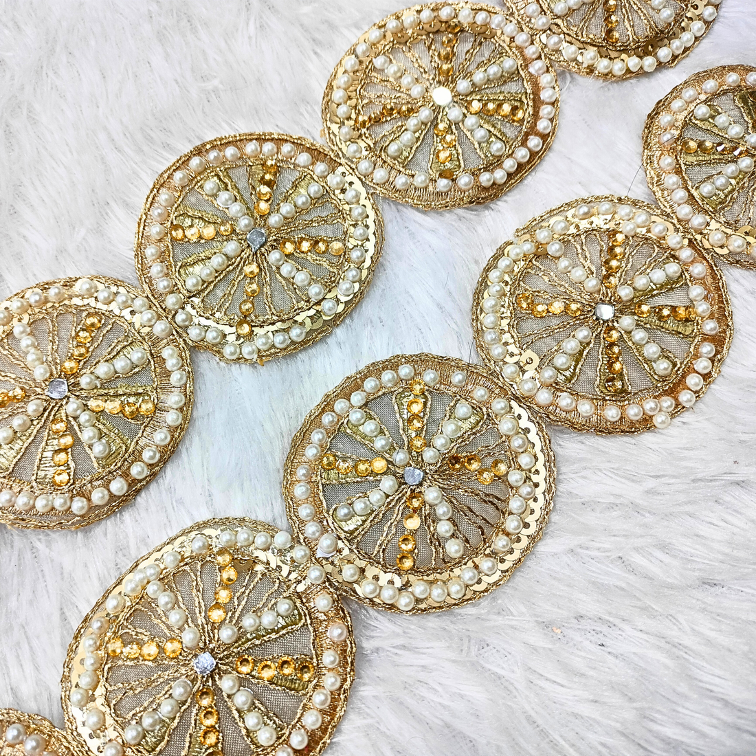 Golden and White Pearl and Stone Embellished Handwork Lace