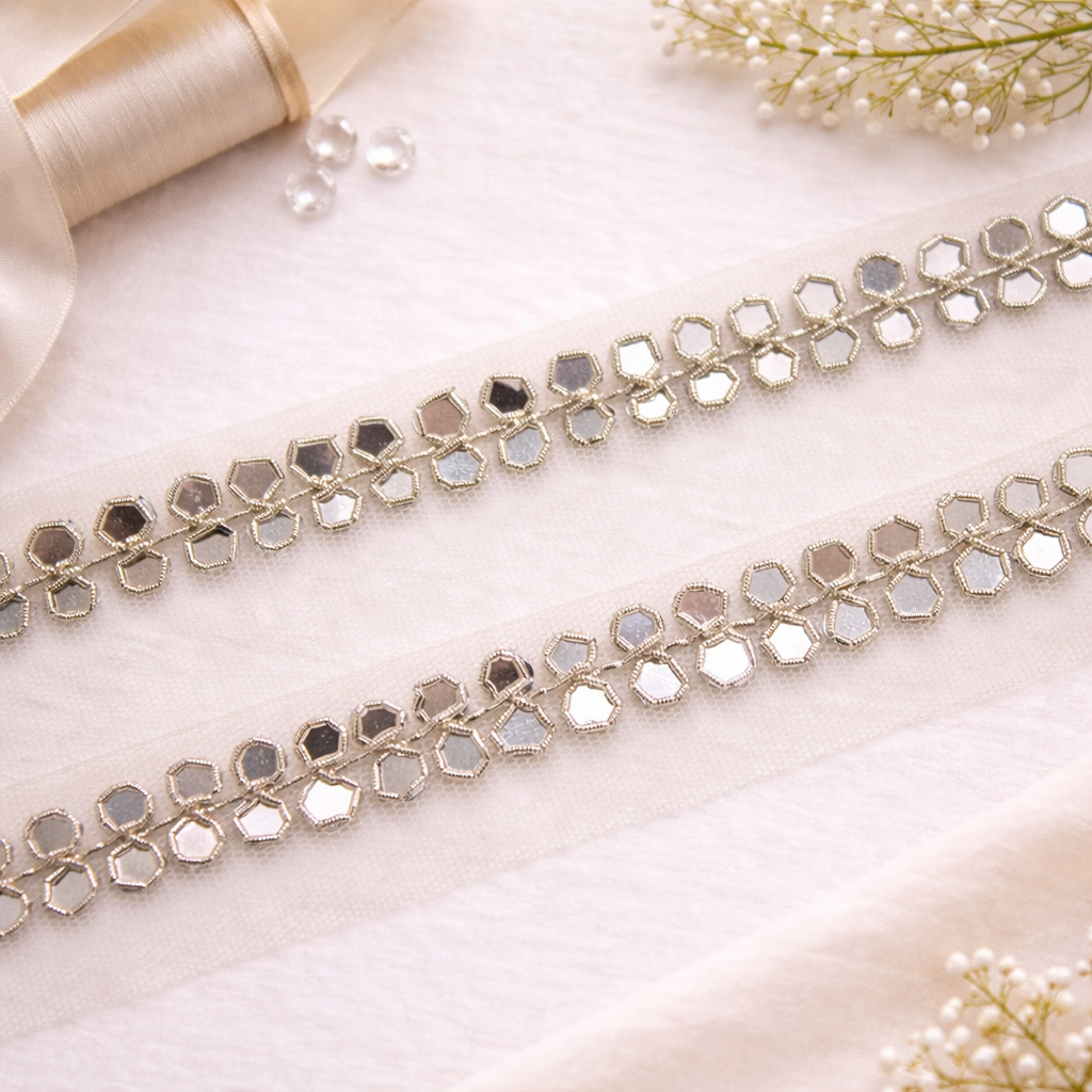 Light Gold Mirror And Stone Embellished Handwork Trim