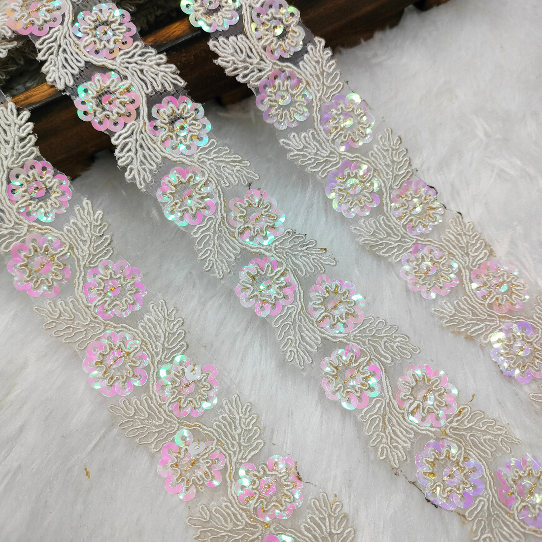 Ivory White Pearl & Sequin Floral Embroidery Lace Trim