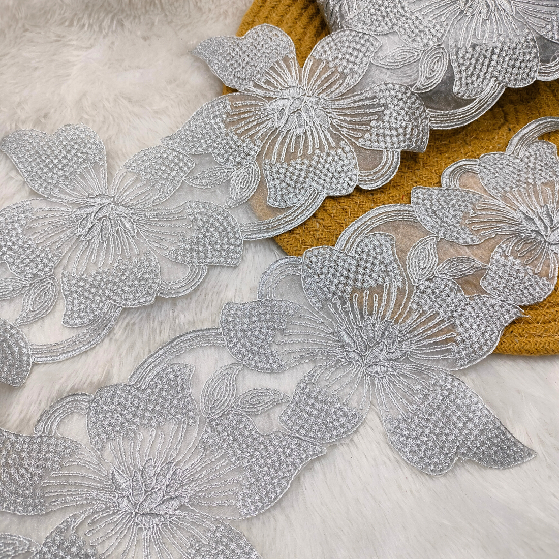 This exquisite silver lace features bold 3D floral motifs crafted with intricate thread detailing. The...