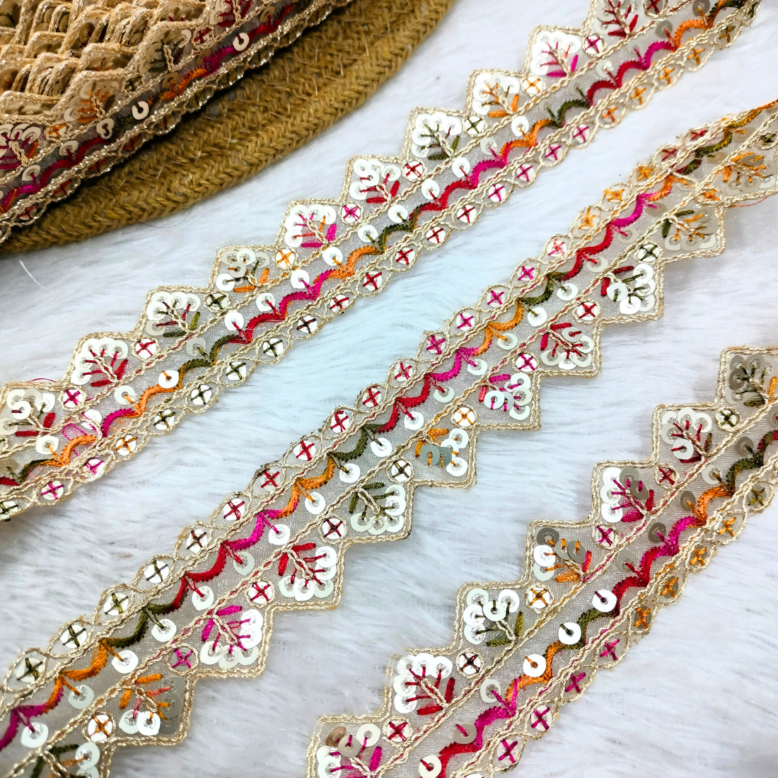 A charming lace featuring alternating pink and mint half-moon motifs embellished with lustrous sequins.Crafted with...