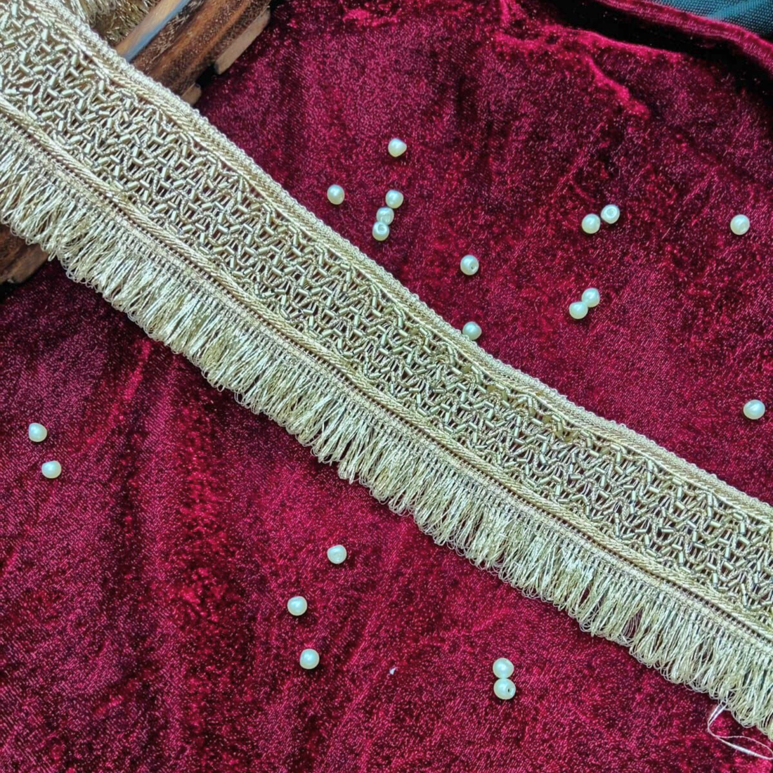 A decorative scalloped lace embellished with gold beads and embroidery details. The scalloped edge adds...