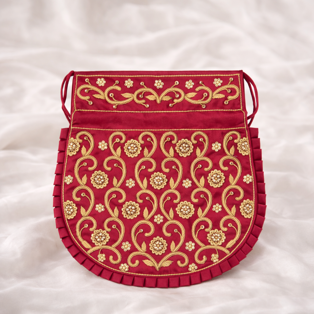This handcrafted maroon silk potli is richly detailed with golden embroidery, making it a luxurious...