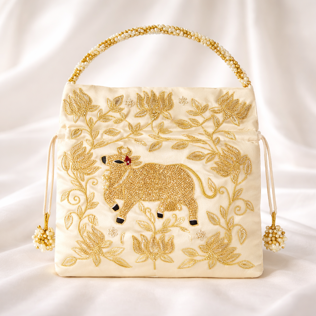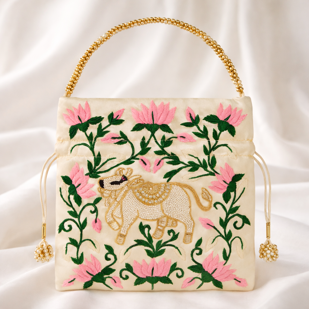 Ivory Lotus & Cow Motif Potli