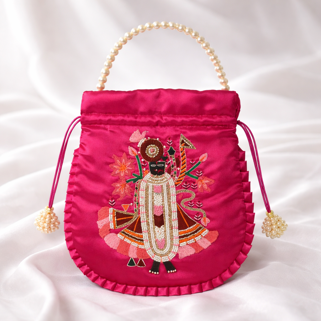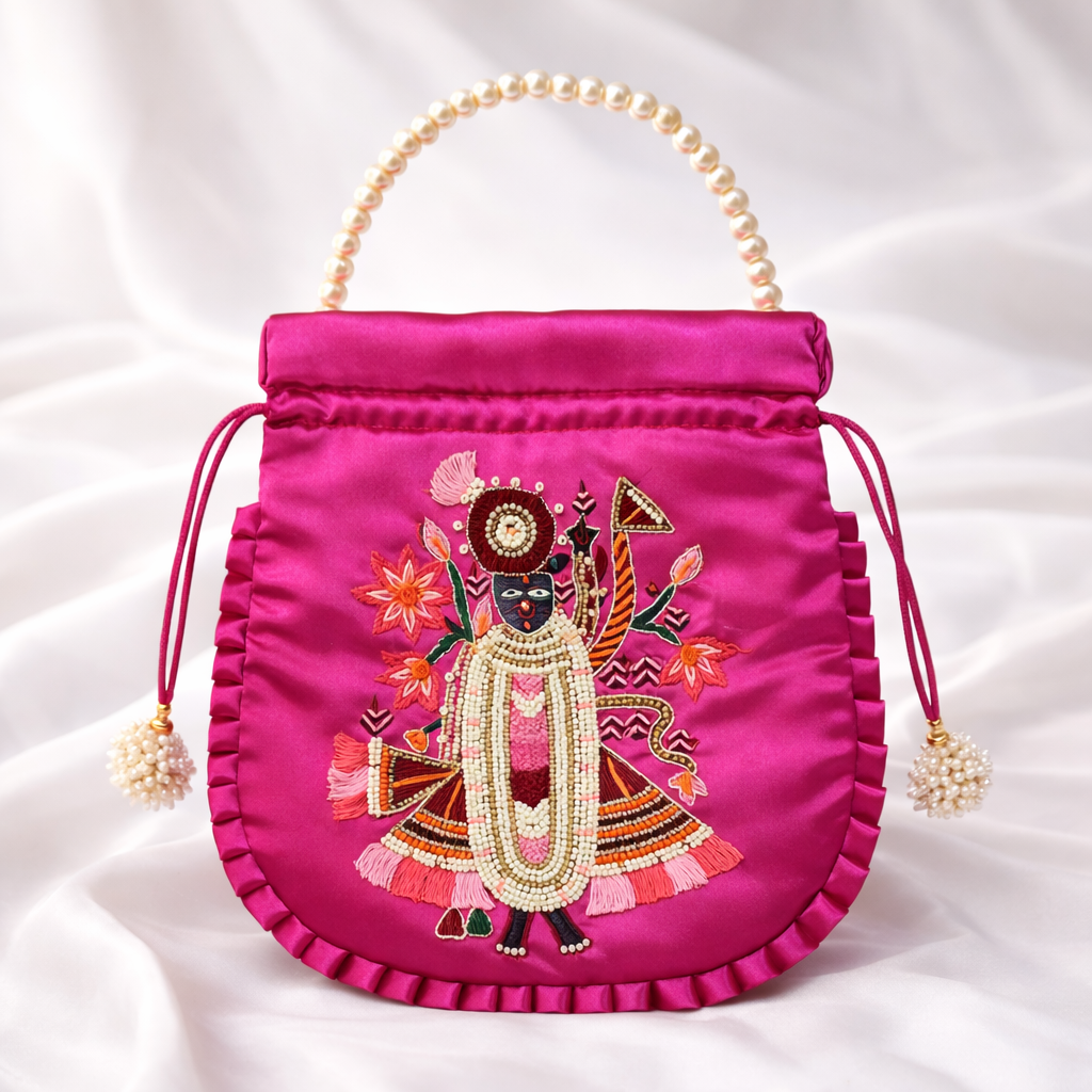 A vibrant hot pink silk potli adorned with intricate Shreenathji embroidery, embellished with pearls, beads,...