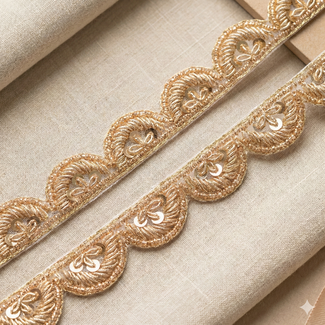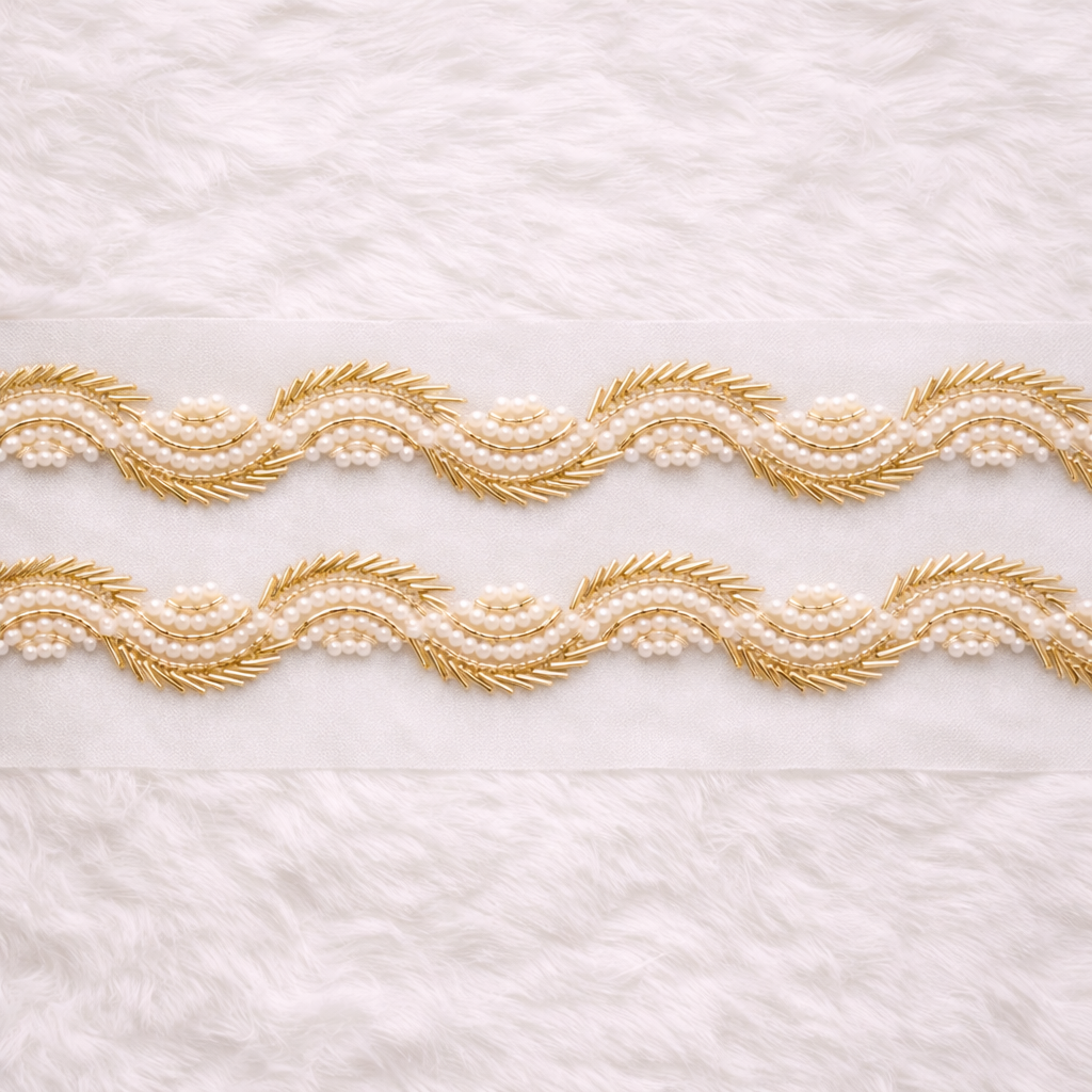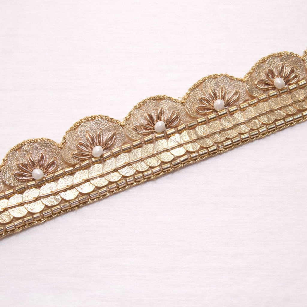 Enhance your creations with our Light Gold Embellished Handwork Trim. This exquisite trim features delicate...