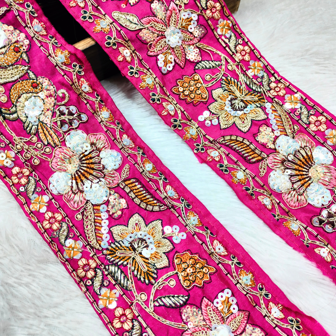 This beautifully crafted lace showcases intricate hand-embroidered floral motifs enriched with sequins, threadwork, and layered...