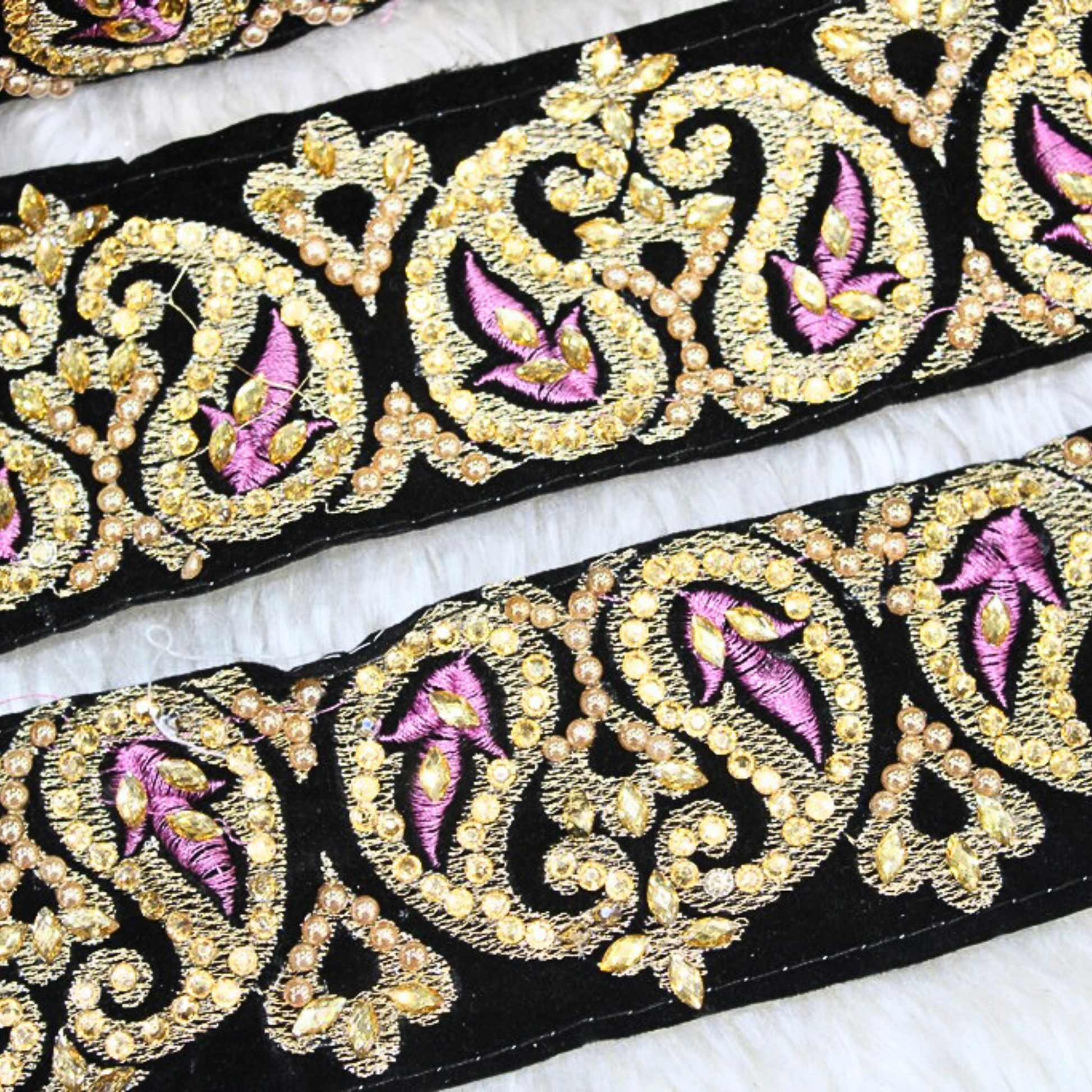 The Black Fancy Zari and Thread Work Embroidered Border combines the elegance of black with the luxurious shine of zari and intricate threadwork. The metallic zari threads, often gold or silver, create a shimmering contrast against the rich black base. Perfect for embellishing sarees, lehengas, dupattas, or home decor items, this border features detailed embroidery with traditional motifs like florals or geometric patterns. It adds a touch of grandeur and sophistication, ideal for festive occasions, weddings, or parties. The fusion of black with zari and threadwork gives a timeless, classic look with modern appeal.