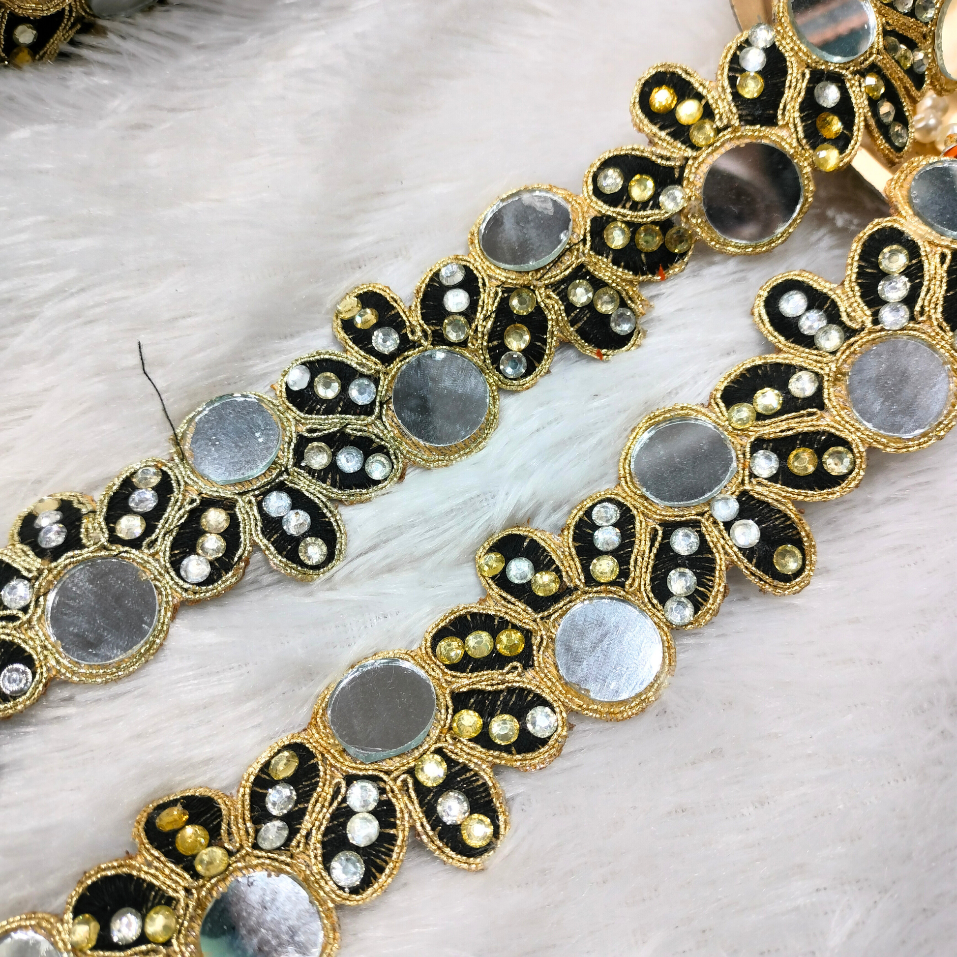 This black floral mirror lace features round mirrors and gold thread detailing for a stunning traditional effect. Suitable for festive outfits, navratri blouses, chaniya cholis, handbags, and decorative crafts. The combination of black and gold makes it timeless and versatile for all color fabrics. It's lightweight yet premium, making stitching easy for both beginners and designers. A beautiful trimming lace for elevating any ethnic creation.