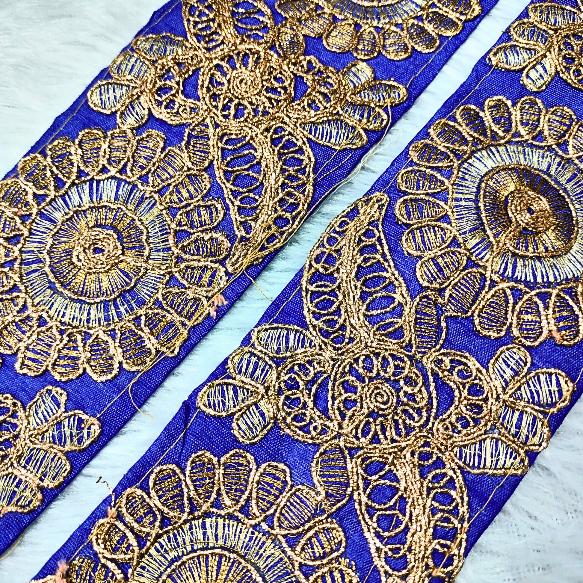 The Blue Fancy Zari and Thread Work Embroidered Border features a striking blue base, beautifully enhanced with intricate zari and threadwork embroidery. The metallic zari threads shimmer against the vibrant blue, adding a touch of luxury, while the detailed threadwork adds depth and texture to the design. Perfect for enhancing sarees, lehengas, dupattas, and home decor, this border brings a rich, elegant look. Ideal for weddings, festivals, and special occasions, it adds a regal and festive finish to any fabric.