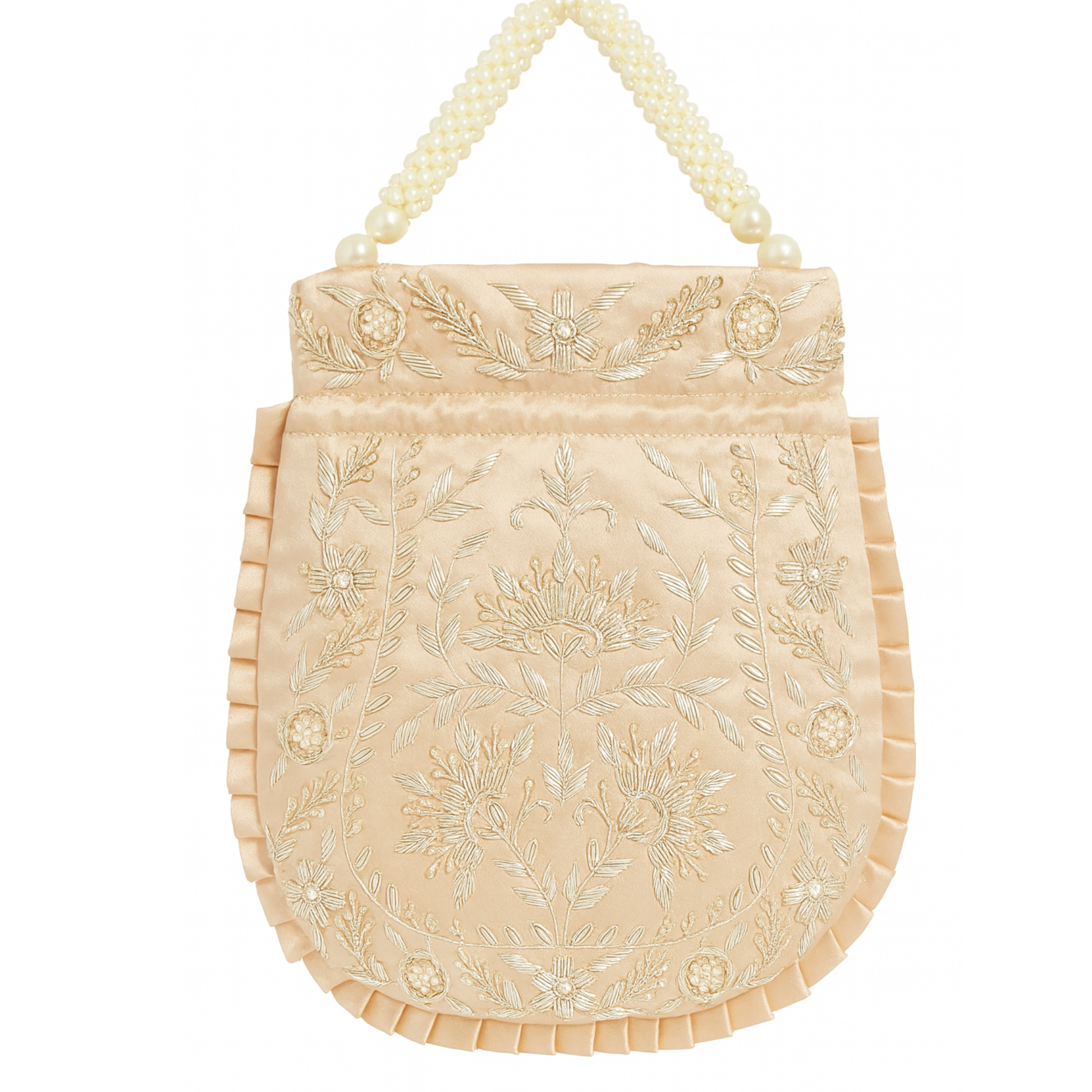 Crafted in subtle champagne gold, this potli is detailed with fine embroidery and intricate handwork. The tone-on-tone design makes it versatile and easy to style. With its elegant bead handle, it strikes the right balance between minimalism and luxury. Ideal for bridesmaids, festive parties, or cocktail ceremonies.