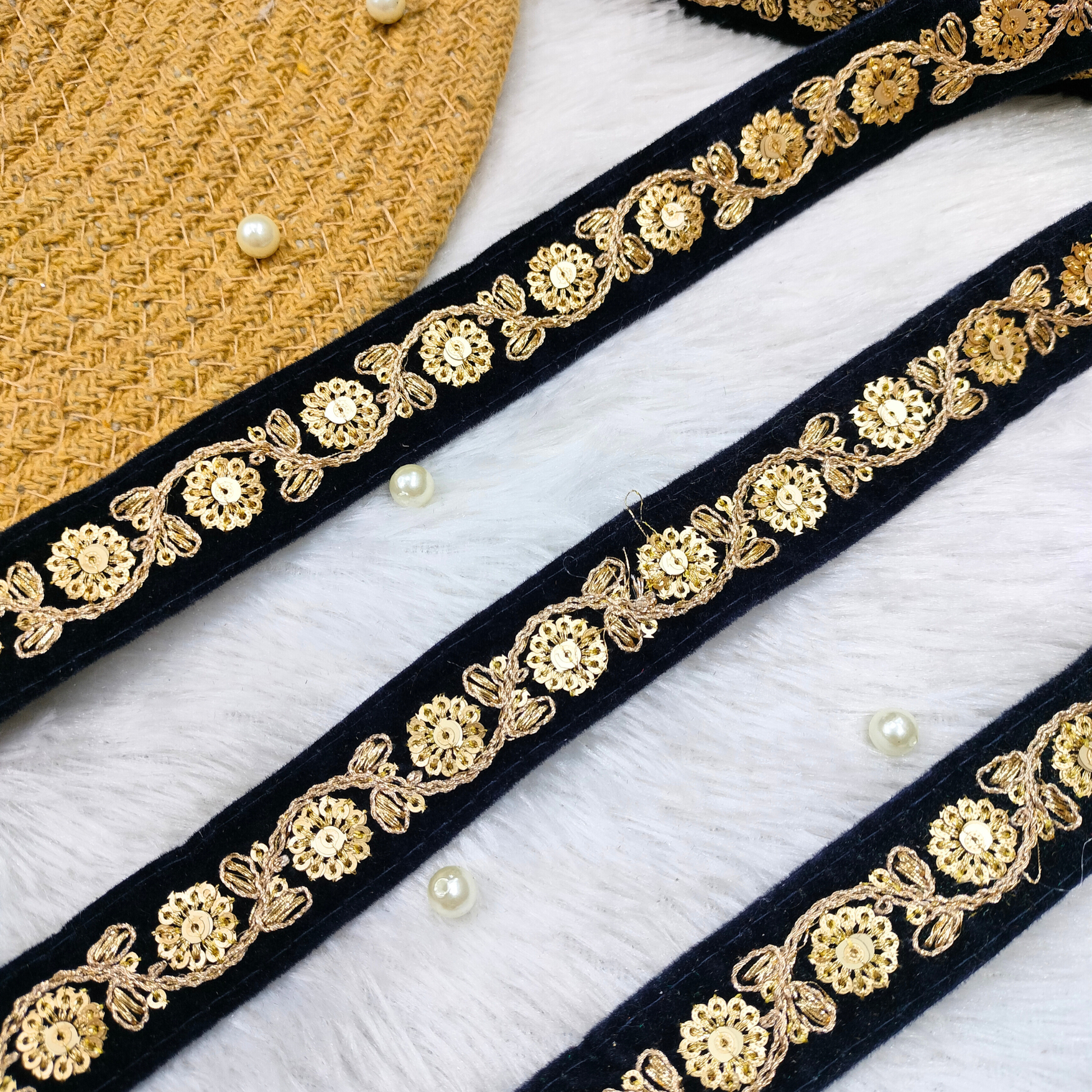 This elegant lace showcases repeating floral motifs enhanced with delicate embroidery and shimmering accents. The pattern is traditional yet versatile, making it suitable for saree borders, kurtas, lehengas, kidswear, and even DIY décor. Its fine craftsmanship adds richness without appearing overpowering, allowing it to blend seamlessly with both simple and heavily embellished fabrics. The border holds its shape beautifully, making it easy to stitch onto a wide range of garments. Perfect for festive collections that need a timeless and graceful touch.