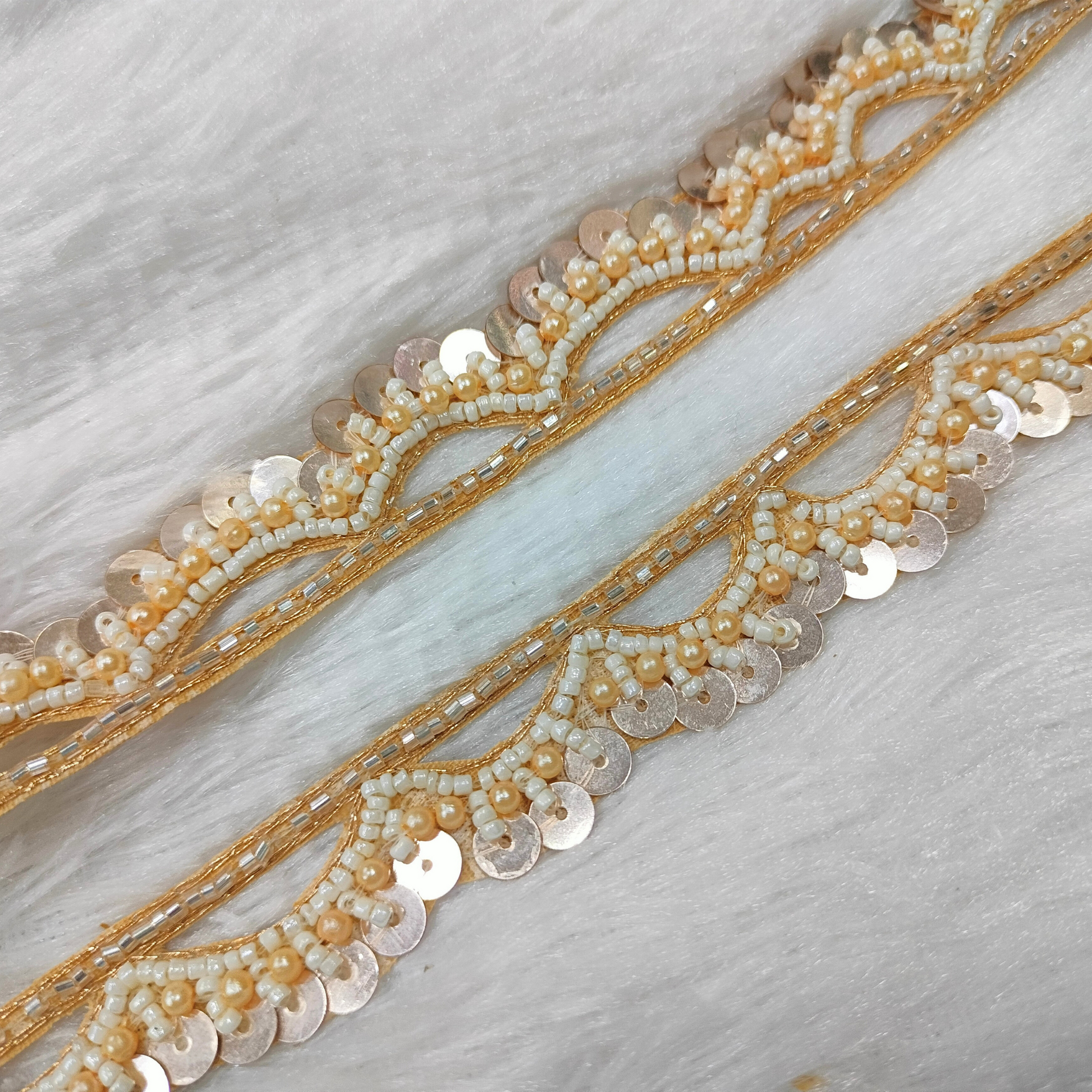 Add a touch of elegance to your creations with our Sequins Embellished Scalloped Handwork Lace. This stunning decorative trim features an intricate scalloped design, beautifully enhanced with golden accents. Perfect for elevating garments, home décor, and craft projects, its luxurious look makes it ideal for weddings, special events, or high-end fashion. The delicate curves and shimmering golden embellishments create a timeless, sophisticated effect, bringing a refined, vintage-inspired charm to any item.