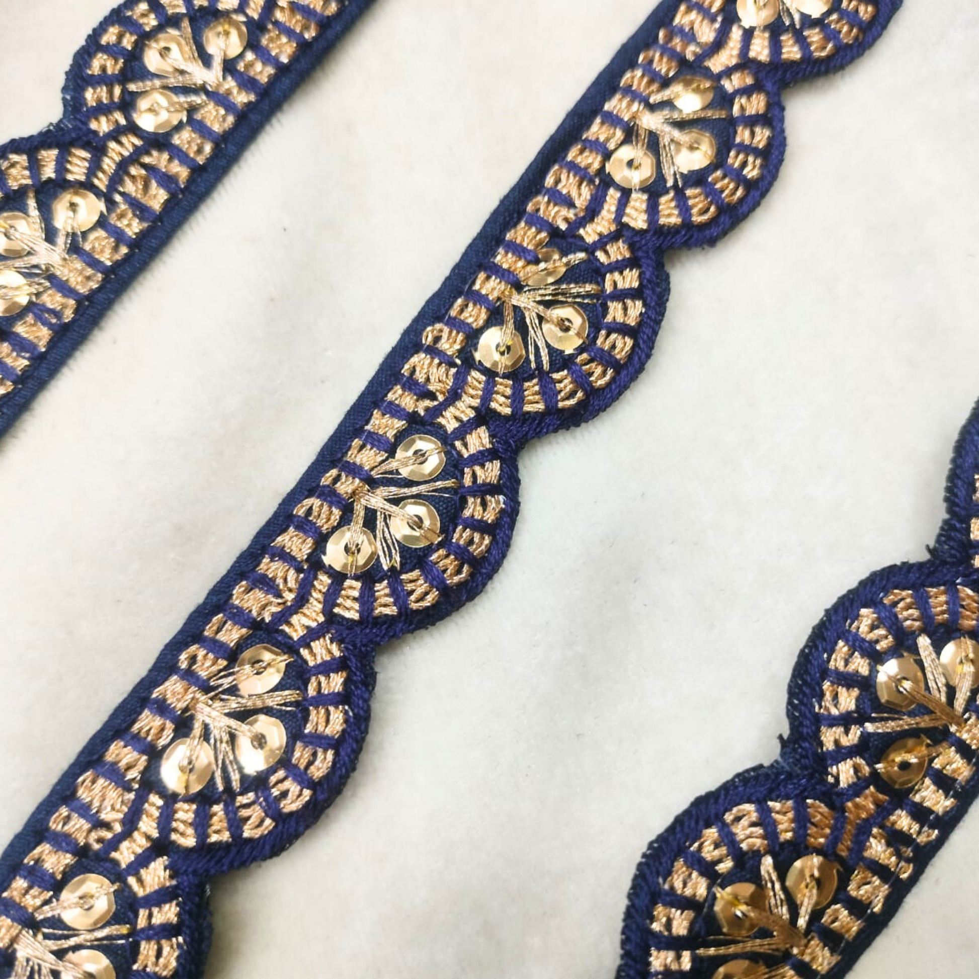 Add elegance to your ethnic creations with this scalloped-edge zari embroidered lace trim in deep green, accented with golden threadwork and sequins. Its unique curved design and intricate floral zari motifs make it ideal for enhancing sarees, lehengas, dupattas, kurtis, and more. Perfect for wedding outfits, festive dresses, and DIY fashion projects.