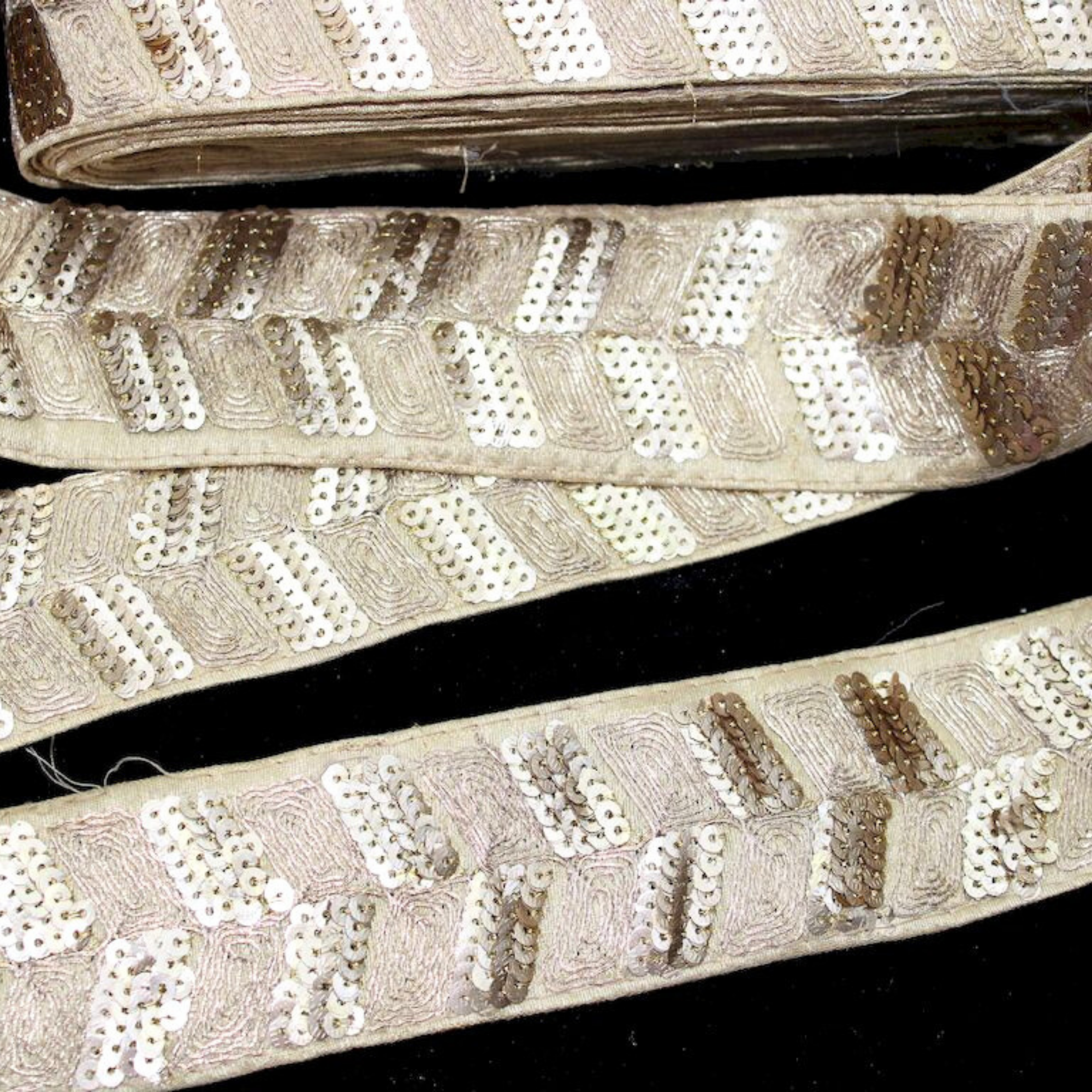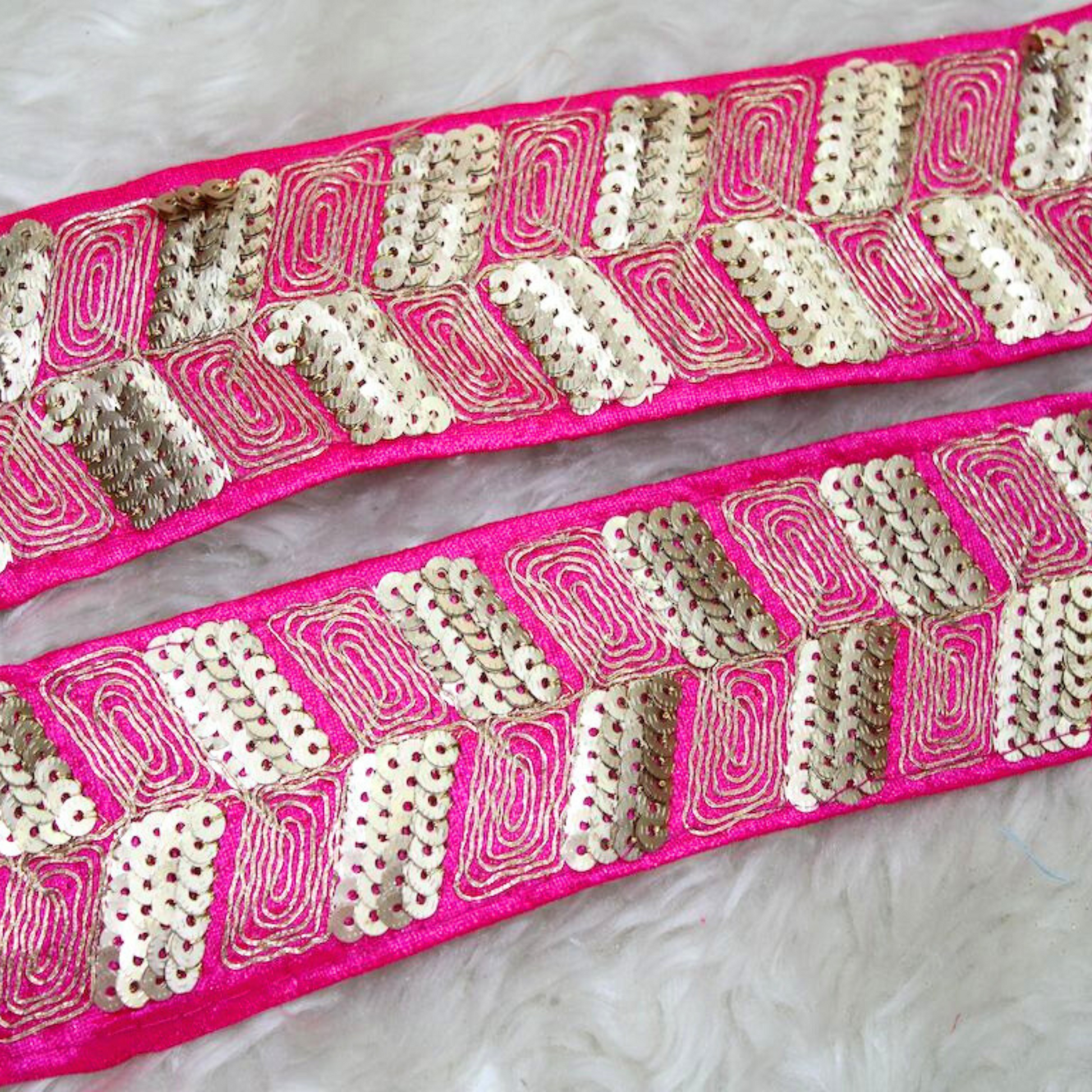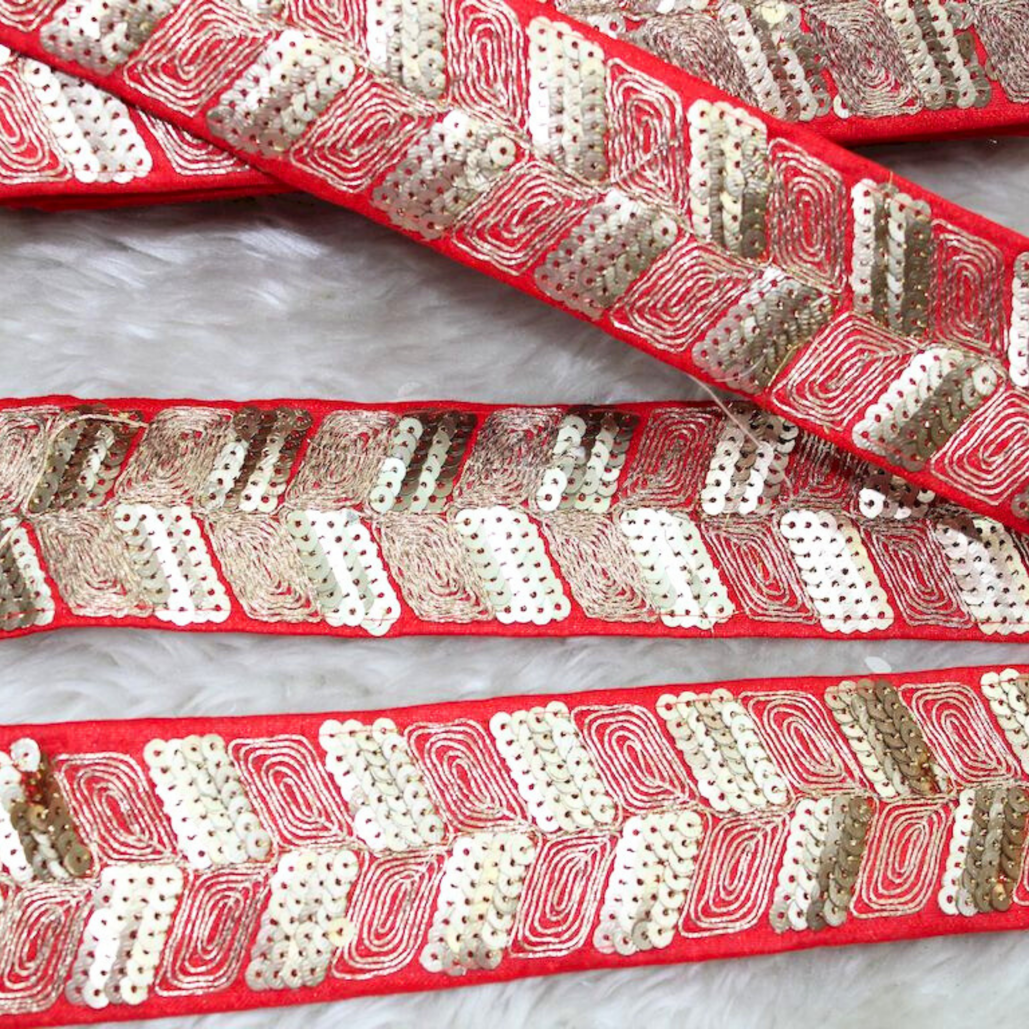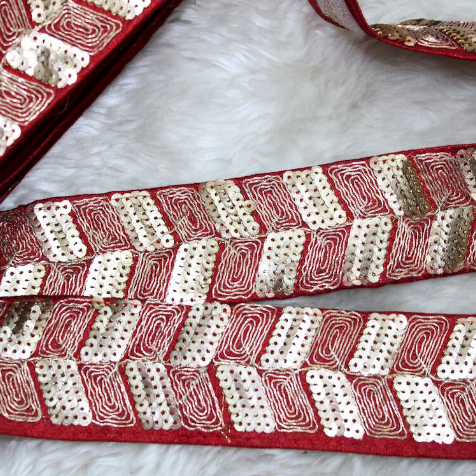 Add a bold and festive touch to your outfits with this dazzling sequin embroidered lace trim featuring a unique geometric chevron pattern in gold on a vibrant red base. Crafted with precision, this designer lace border is ideal for sarees, lehengas, dupattas, blouses, and wedding trousseau pieces. The shimmer of sequins makes it perfect for festive wear, bridal outfits, and party fashion projects.