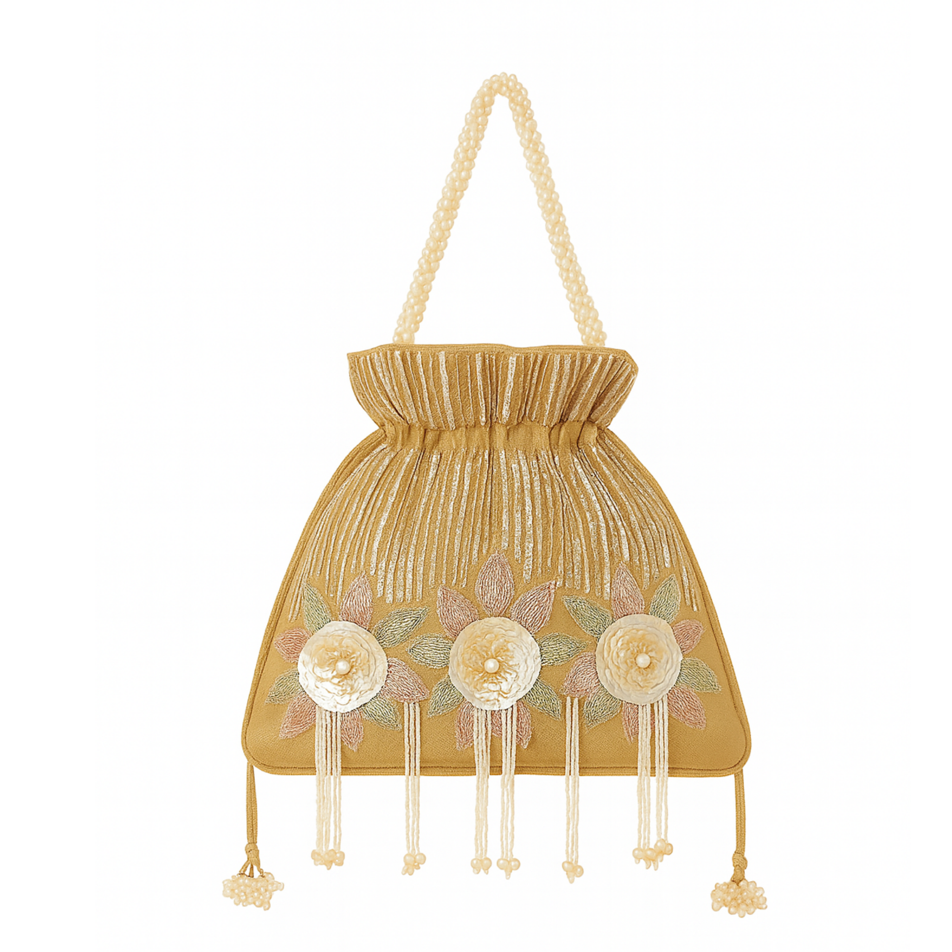 A unique potli featuring delicate floral appliqué and 3D embellishments, enhanced with pearl strings and golden embroidery. Its contemporary floral design gives a fresh, modern twist to traditional handwork. Perfect for mehendi, haldi, and gifting purposes.