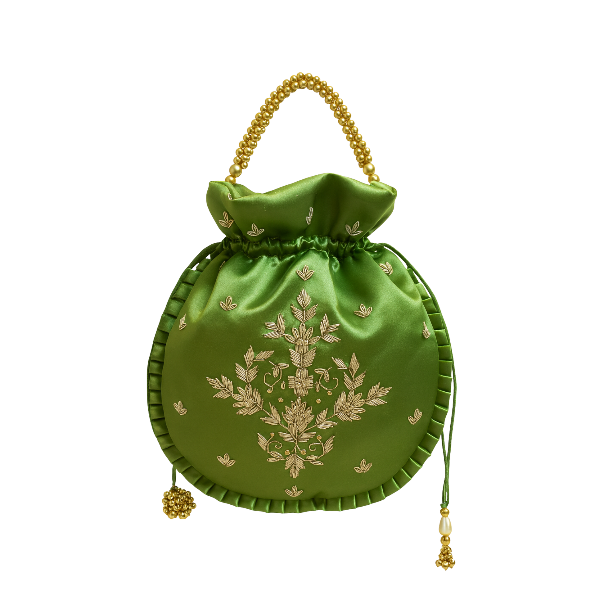 This handcrafted lime green potli radiates freshness with golden embroidery and pearl tassel accents. The vibrant color makes it a standout accessory for Mehendi and festive functions. Lightweight and stylish, it balances modernity with tradition. Perfect for bridesmaids and party looks. A handcrafted wedding potli bag with a trendy twist.