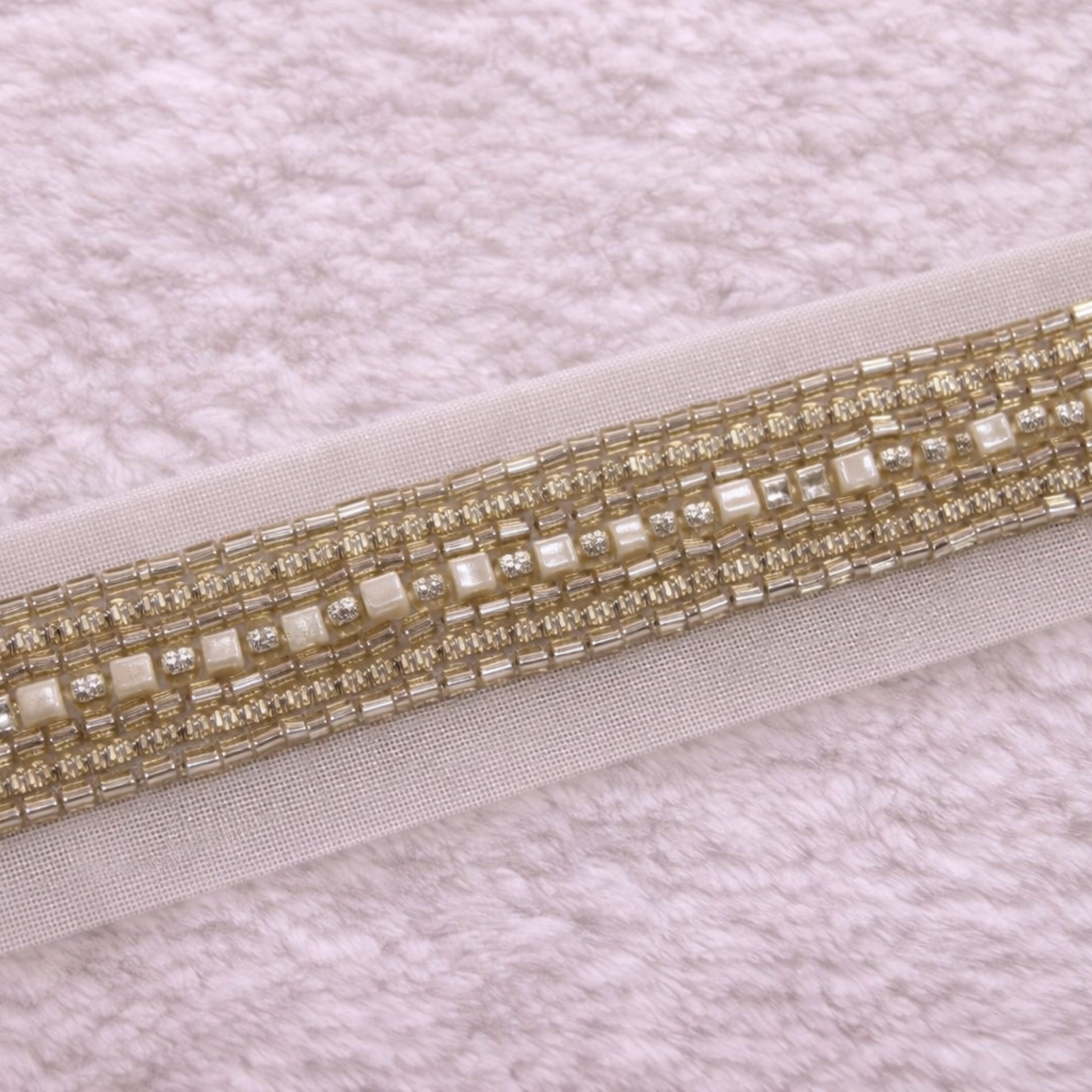 This lace is designed with gold beads and small square stones arranged in straight lines. It gives a rich and premium look to garment borders. The net base keeps the lace flexible. It is easy to stitch and sits well on fabric. Ideal for bridal and designer outfits.
