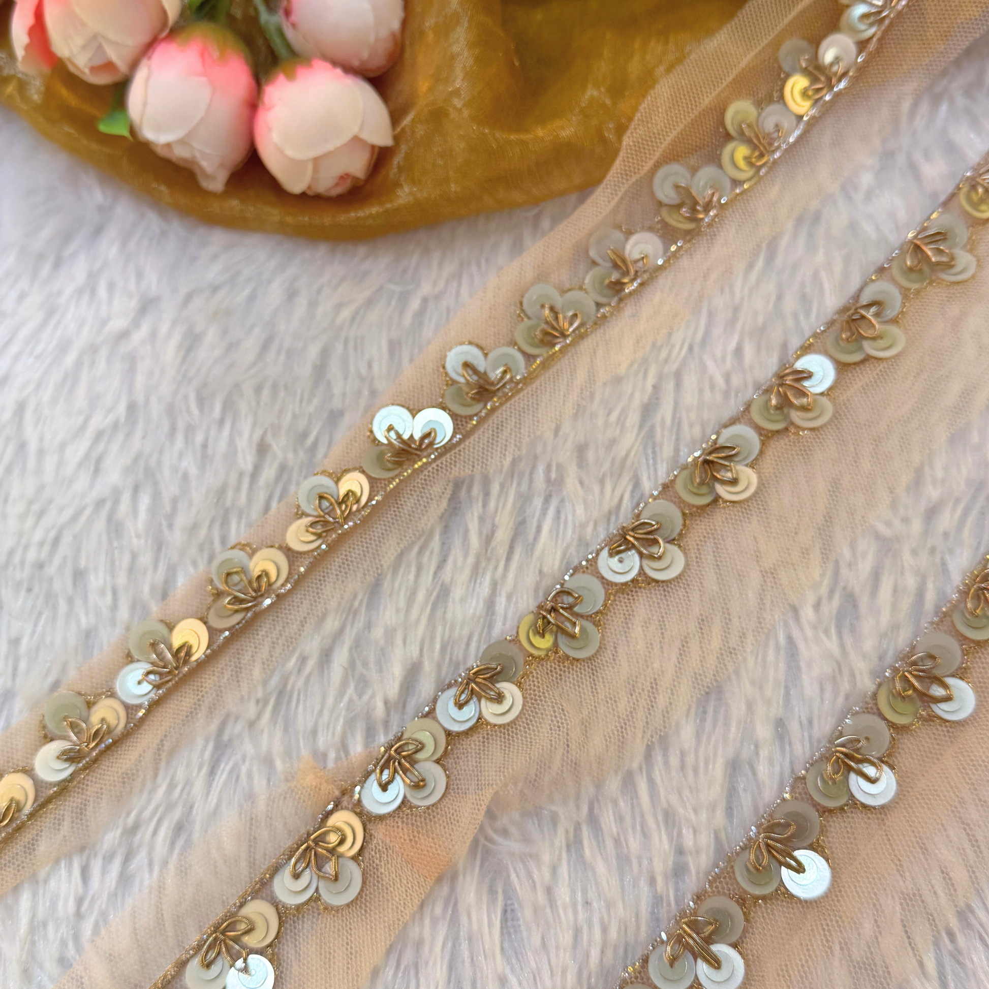 Our Gold Shimmer Floral Embroidered Handwork Lace Border adds a touch of radiant elegance with its intricate gold threads that shimmer and catch the light. The rich golden embroidery creates a luxurious, sophisticated finish, perfect for adding glamour to any design. Ideal for home décor, special events, or high-end stationery, this border enhances your creations with timeless beauty. The delicate embroidery offers texture and depth, making your projects truly stand out. Infuse your designs with the glowing charm and opulence of this golden shimmer embroidered border.