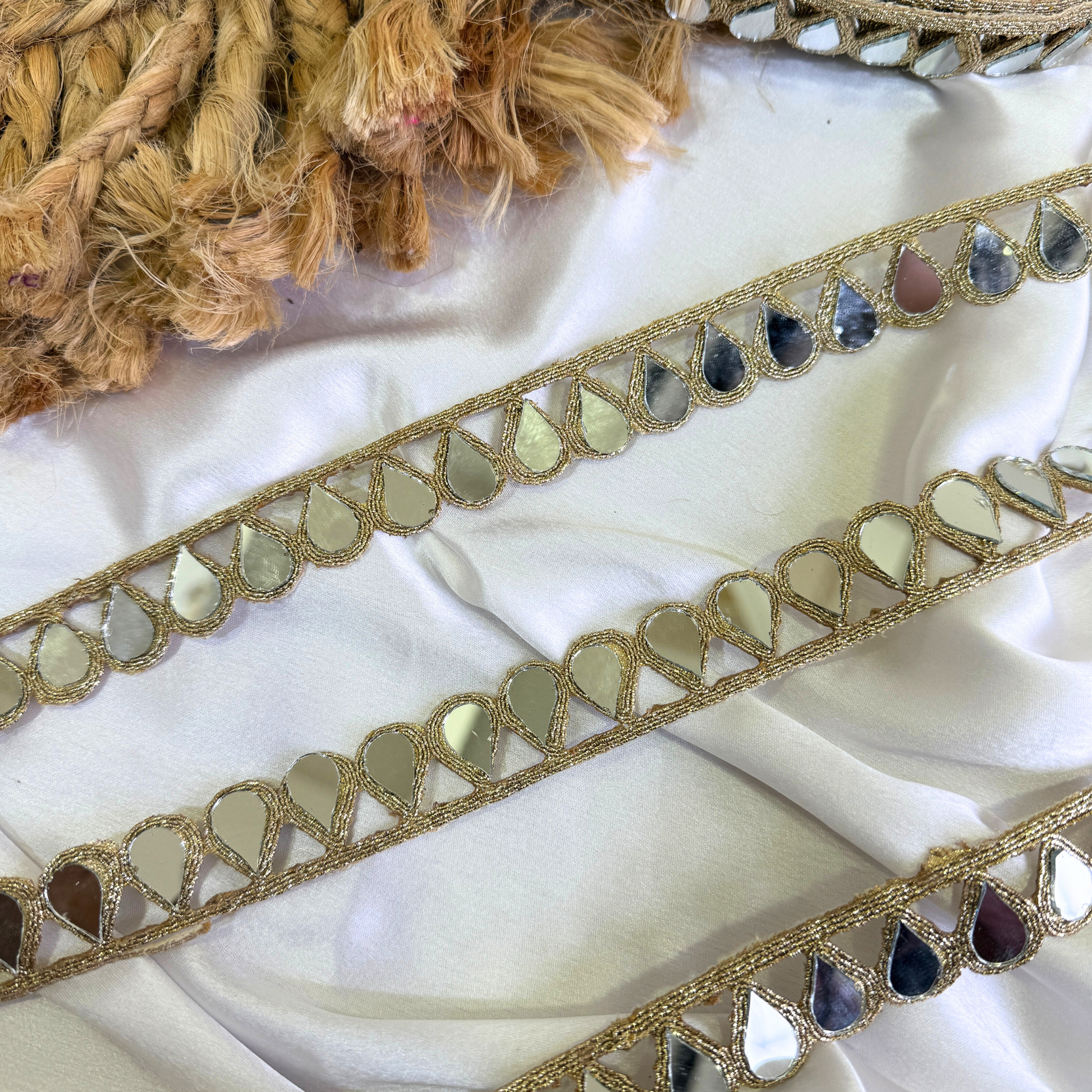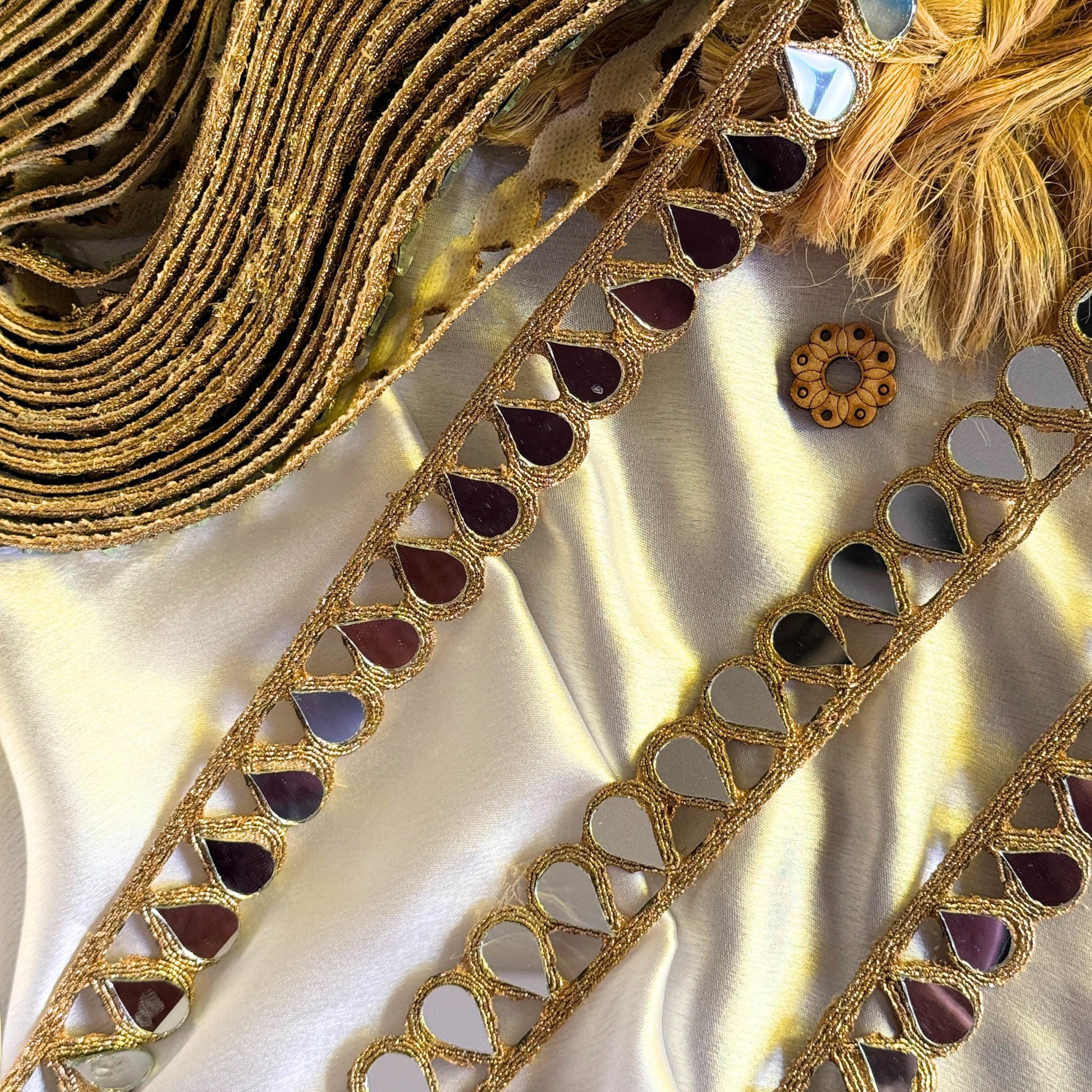 This elegant lace features teardrop-shaped mirror elements neatly set within fine gold thread detailing, forming a clean and timeless border. The reflective mirror finish adds brightness and visual interest without overpowering the design.