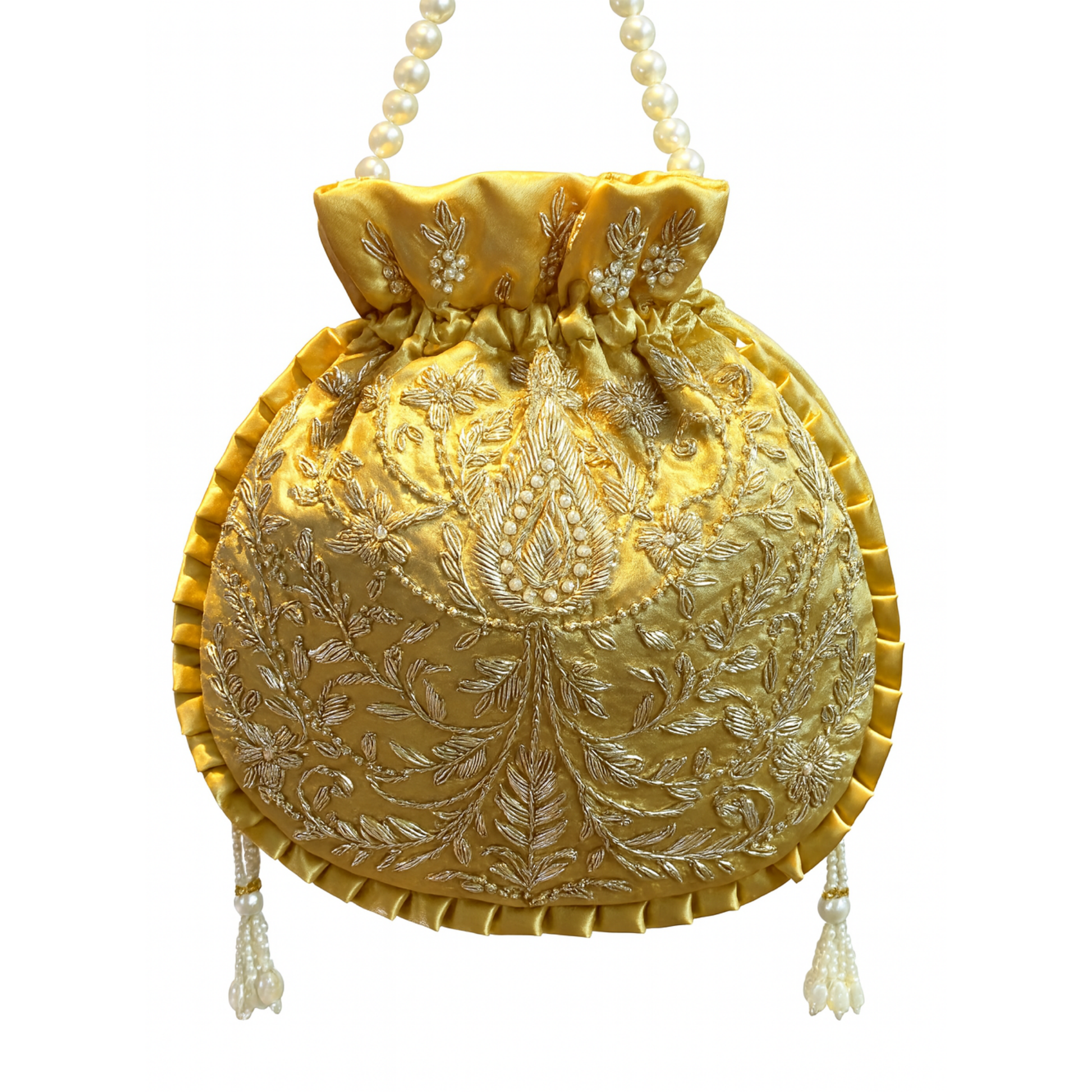 This royal golden potli is designed with intricate floral and paisley motifs in heavy embroidery, finished with a pearl handle. Its classic charm makes it a versatile piece for weddings, bridal looks, and festive parties. A timeless addition to your ethnic collection.