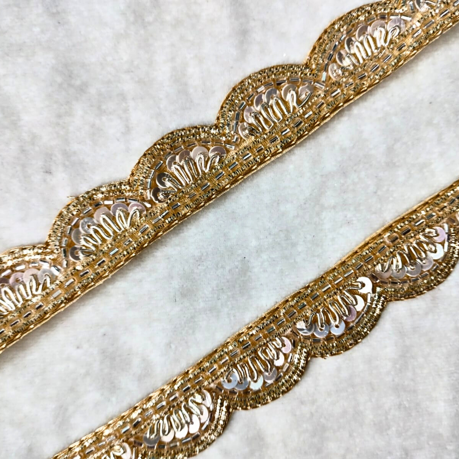 Enhance your creations with the graceful beauty of our Golden Scalloped Trim. Expertly designed with a delicate scalloped pattern, this trim features luxurious golden threadwork that exudes sophistication and charm. The rich golden hue adds a timeless, opulent touch, making it the perfect choice for accenting sarees, lehengas, dupattas, and home décor. Whether for weddings, festive events, or high-end fashion, this Golden Scalloped Trim brings an elegant finish to your pieces, infusing them with refined beauty and grandeur.
