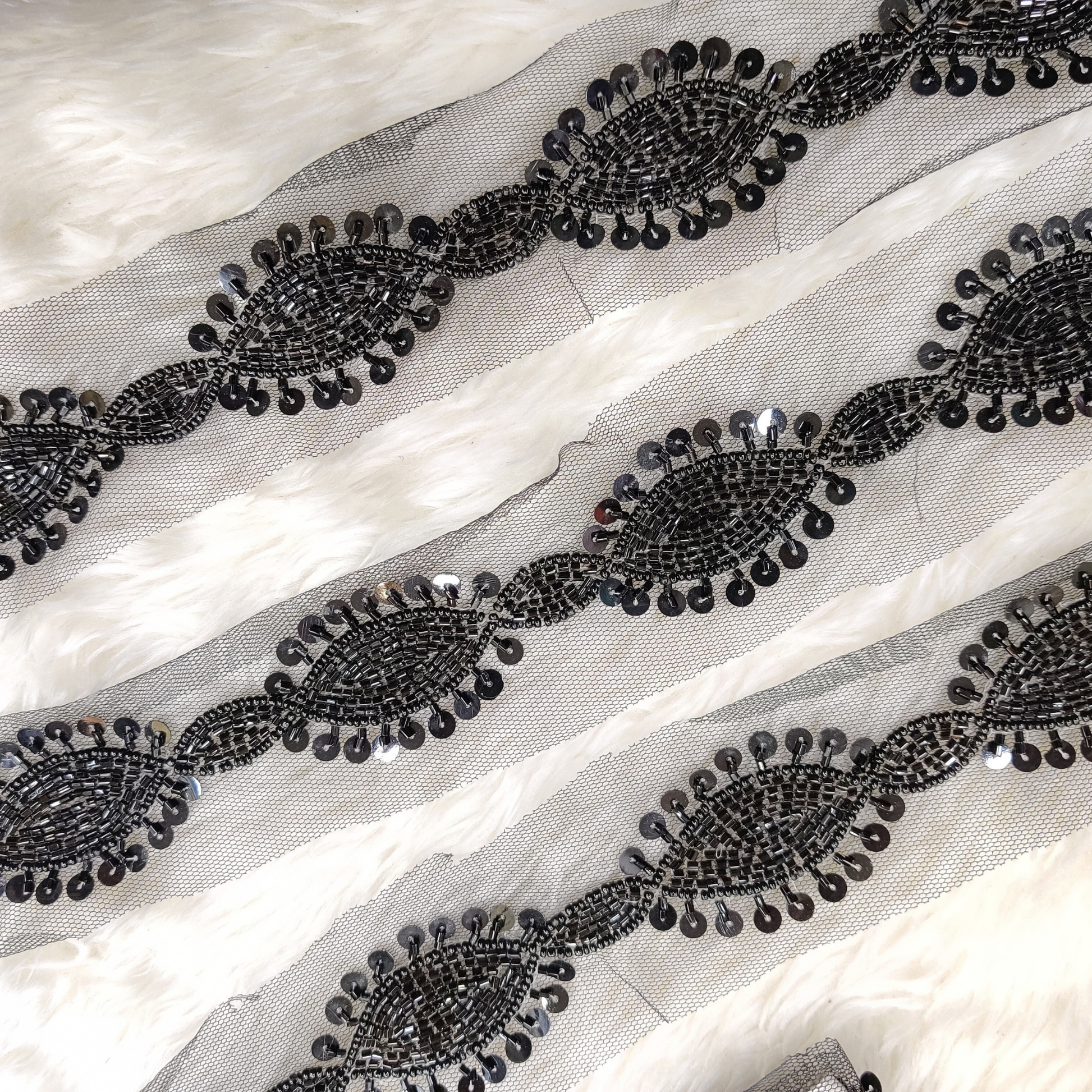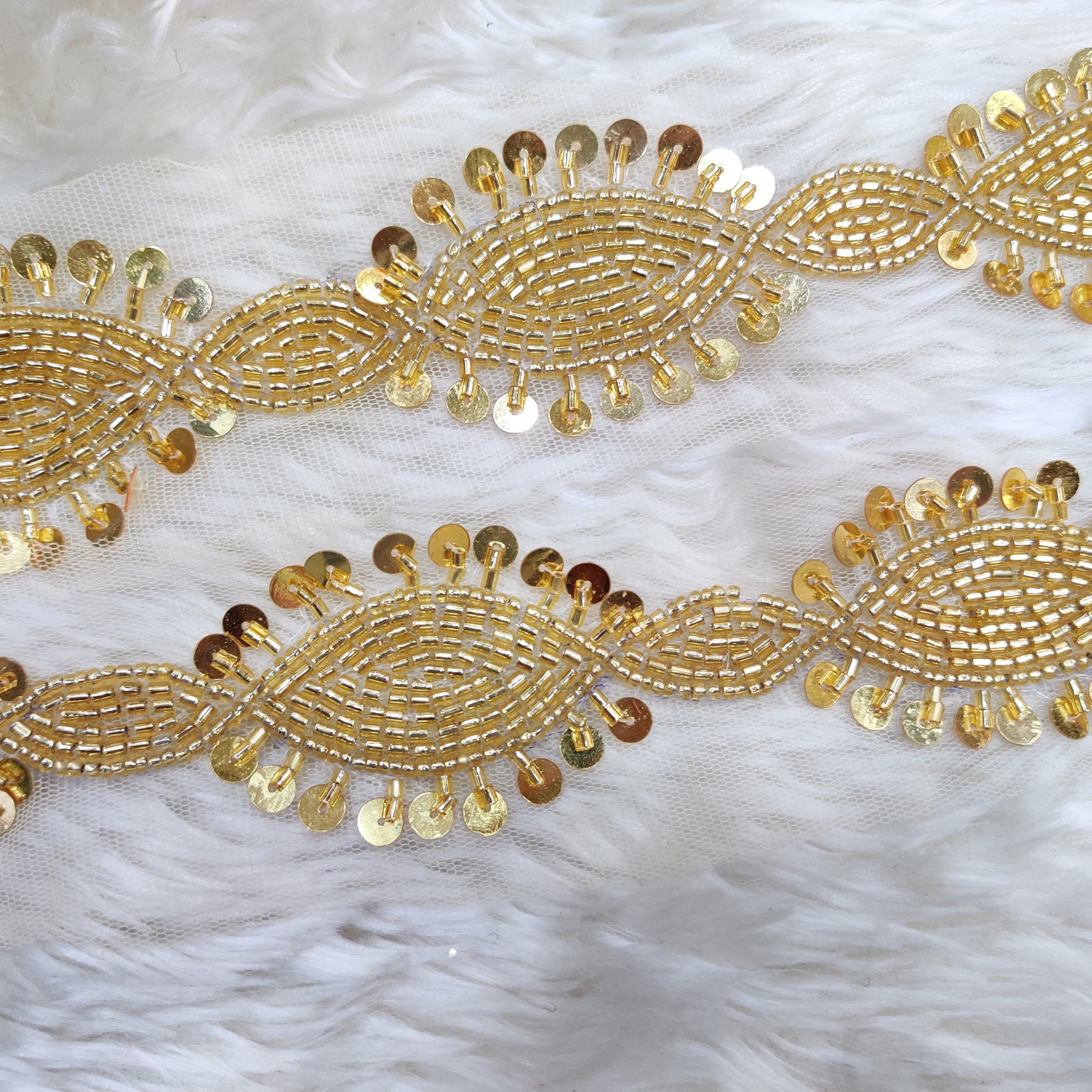 This stunning trim features intricate handwork and exquisite sequin embellishments, creating a radiant and sophisticated effect. Perfect for enhancing garments, accessories, and home decor, it brings elegance and charm to any design. Easy to apply, making it suitable for crafters of all skill levels. Elevate your creations with the timeless beauty of sequin handwork lace!