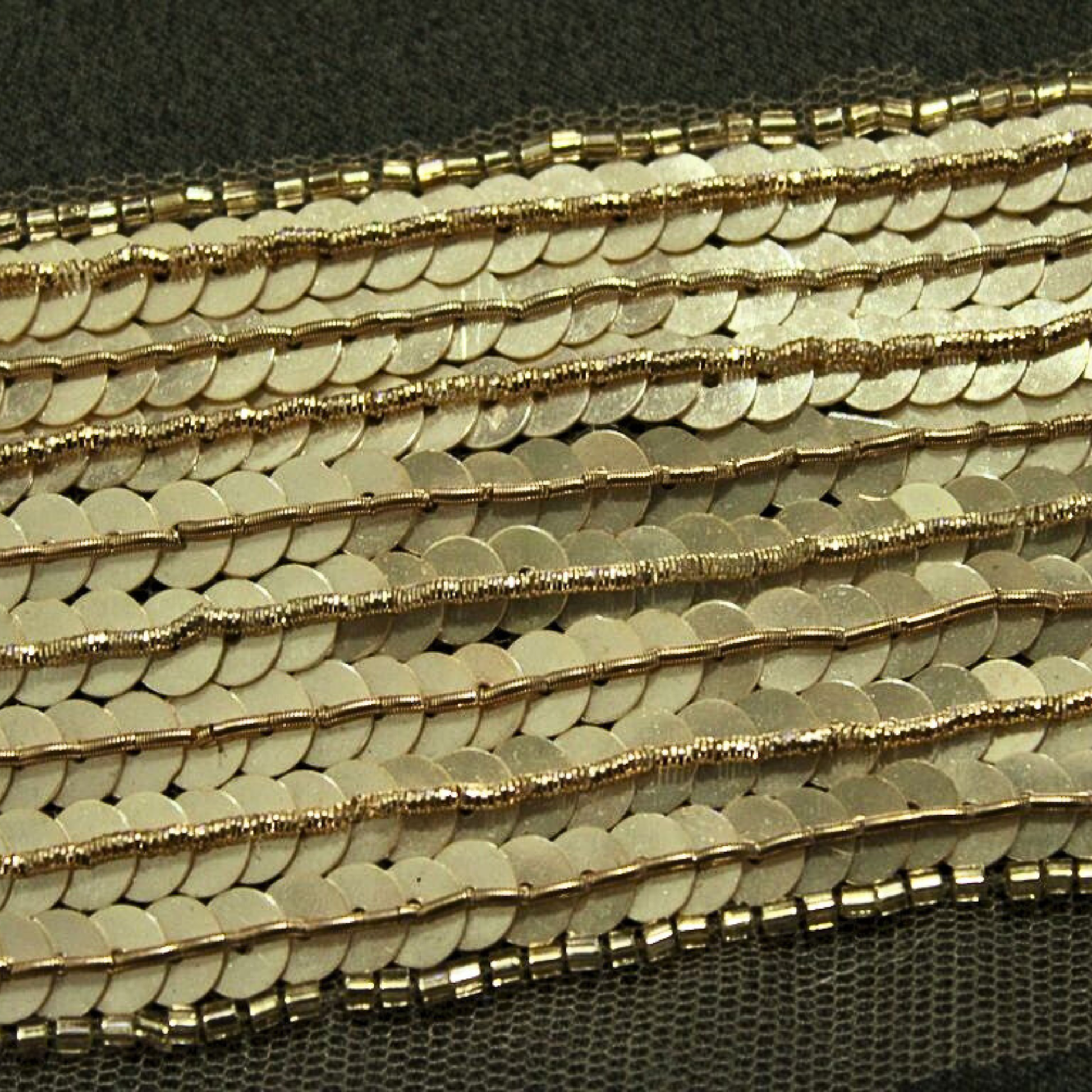 Infuse your designs with sparkle and glamour using our Golden Sequin Trim. This stunning trim features shimmering golden sequins that are intricately sewn into a beautiful pattern, creating a dazzling effect with every light reflection. The luxurious golden tone adds a rich, radiant touch to any project, making it perfect for elevating the elegance of your designs.
