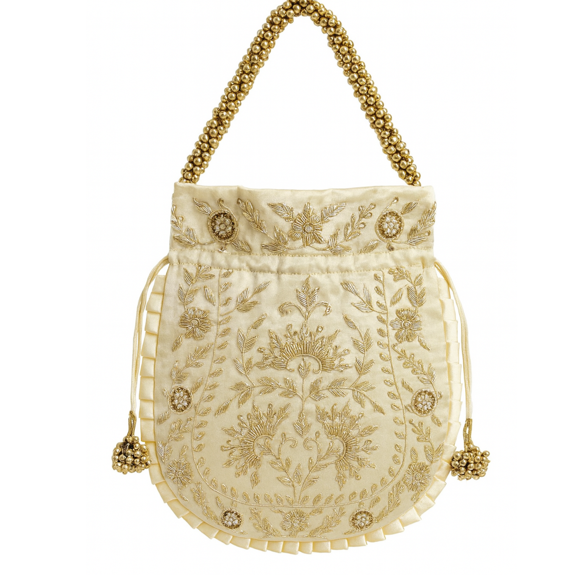 This golden potli is embellished with zardozi embroidery in rich floral designs. Its golden bead handle enhances its luxurious appeal. A timeless accessory, it pairs beautifully with both lehengas and sarees. Best suited for weddings, receptions, and traditional gatherings.