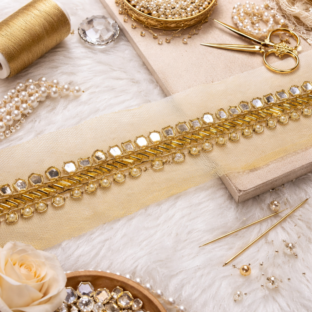 Add timeless elegance to your creations with this hand-embroidered mirror and pearl lace trim, crafted on a soft net base. This luxurious border features finely placed reflective mirror elements, delicate pearl drops, and a rich gold zari finish, giving it a regal yet refined look.