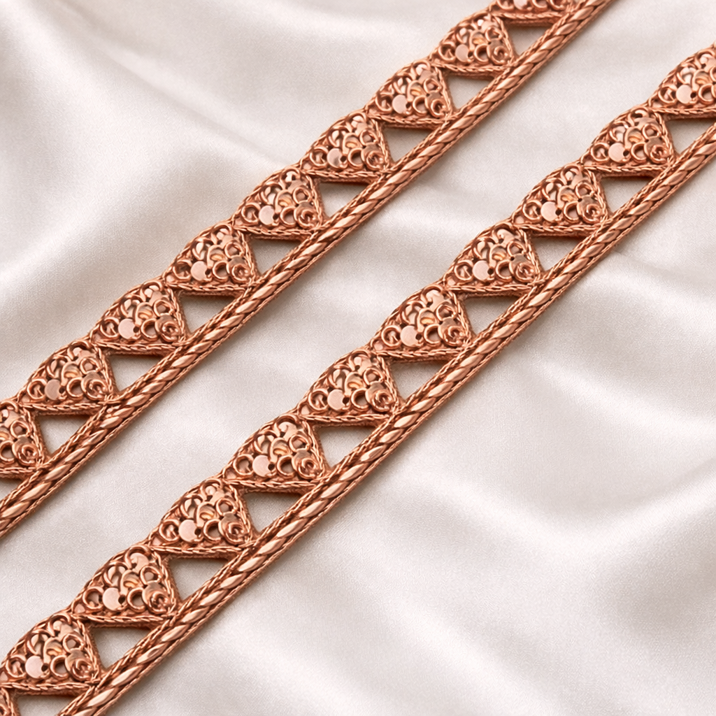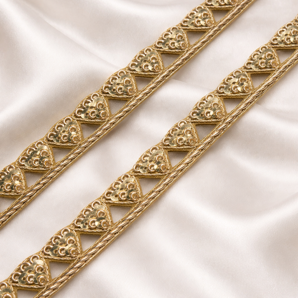 A beautifully handcrafted lace trim featuring delicate triangle motifs embellished with shimmering cutdana and sequins. Designed to add a refined festive touch, this elegant border works perfectly for sarees, lehengas, dupattas, blouses, and couture garments. Its intricate detailing and subtle shine make it an ideal choice for bridal, festive, and designer creations.