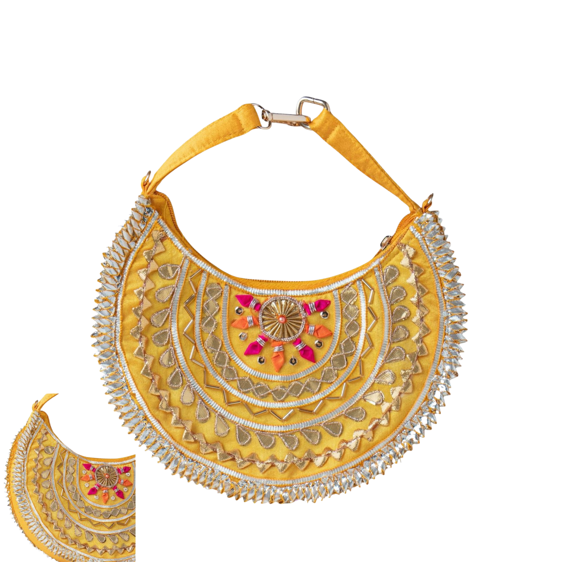 This handcrafted half-moon handbag is designed with intricate zari embroidery, mirror work, and vibrant detailing, making it a true festive statement piece. Available in rich colors like green, orange, yellow, pink, and red, it complements both traditional and Indo-western outfits beautifully. The sturdy handle and detailed embellishments add elegance while keeping it practical and spacious enough for essentials. Perfect for weddings, haldi, mehendi, and festive occasions, this bag is a blend of timeless artistry and modern charm.