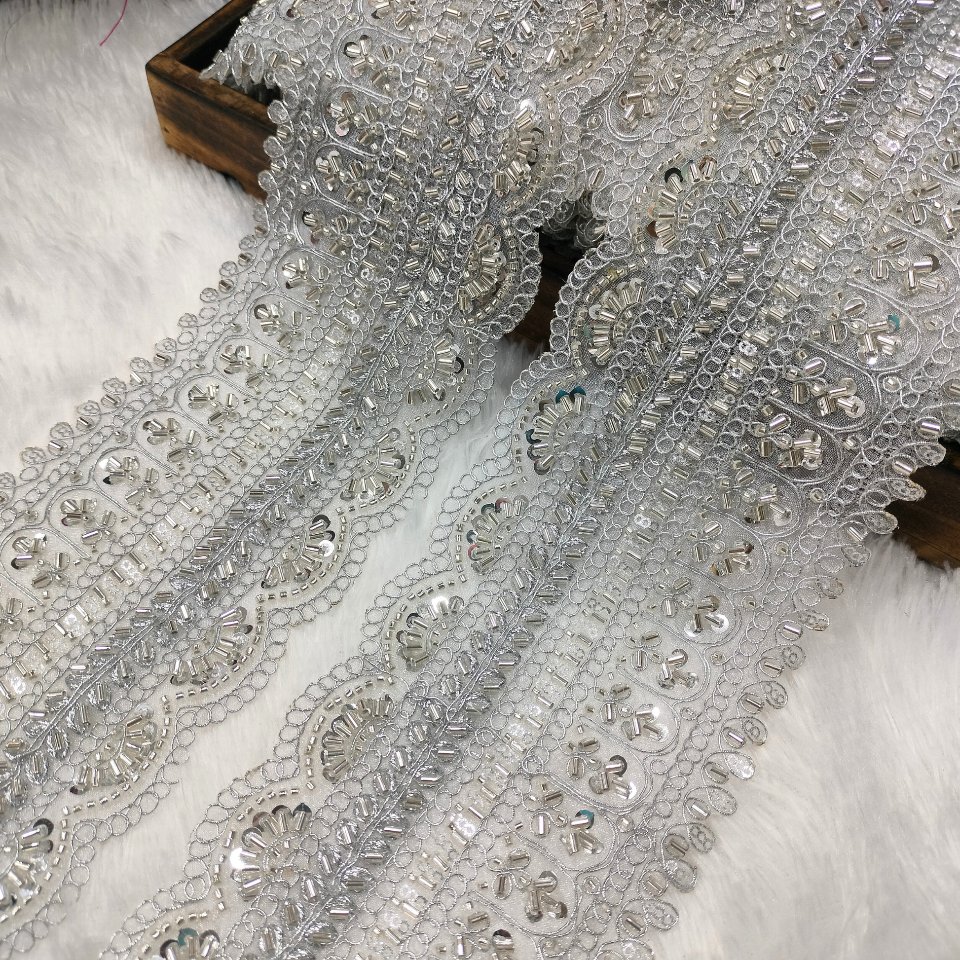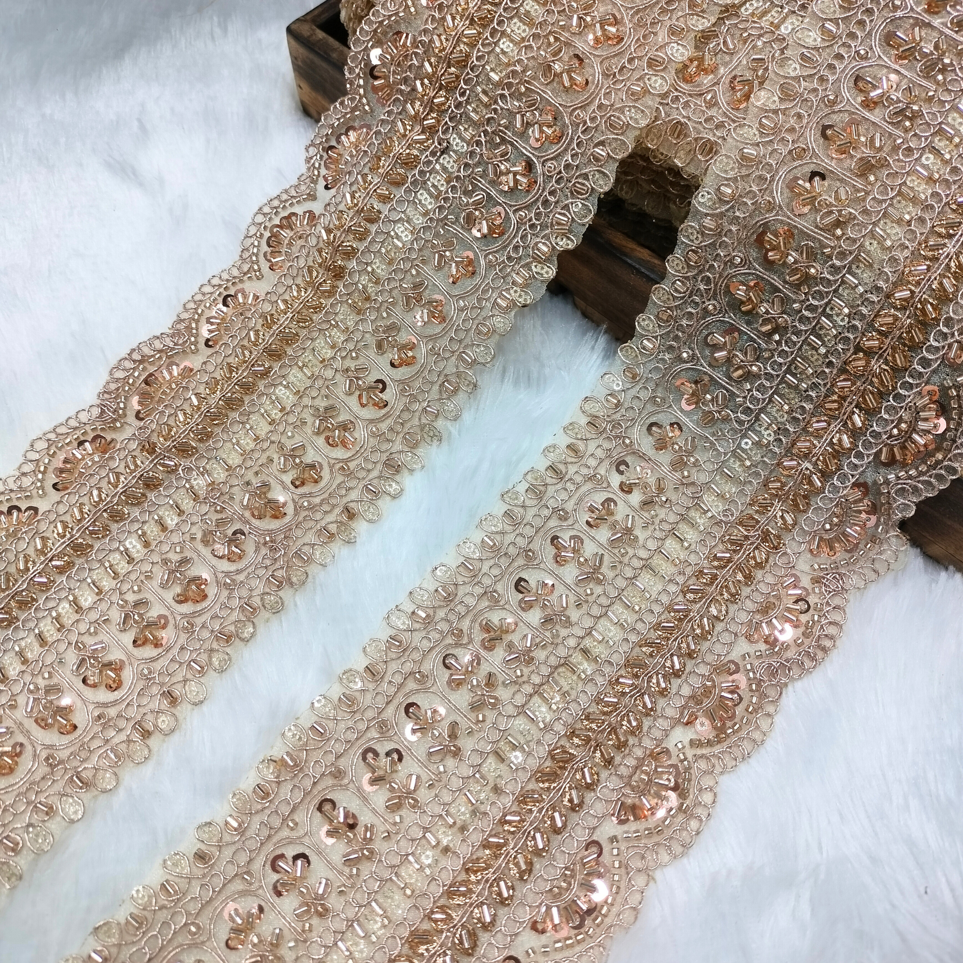 This richly detailed lace trim showcases elaborate embroidery work crafted on a sturdy fabric base, enhanced with dense sequin embellishments and finely arranged beadwork. The design features repeating arched and floral-inspired motifs, accented with layered cutwork patterns that add depth and dimension to the border. Intricate thread detailing runs throughout the lace, creating a luxurious, structured appearance.
