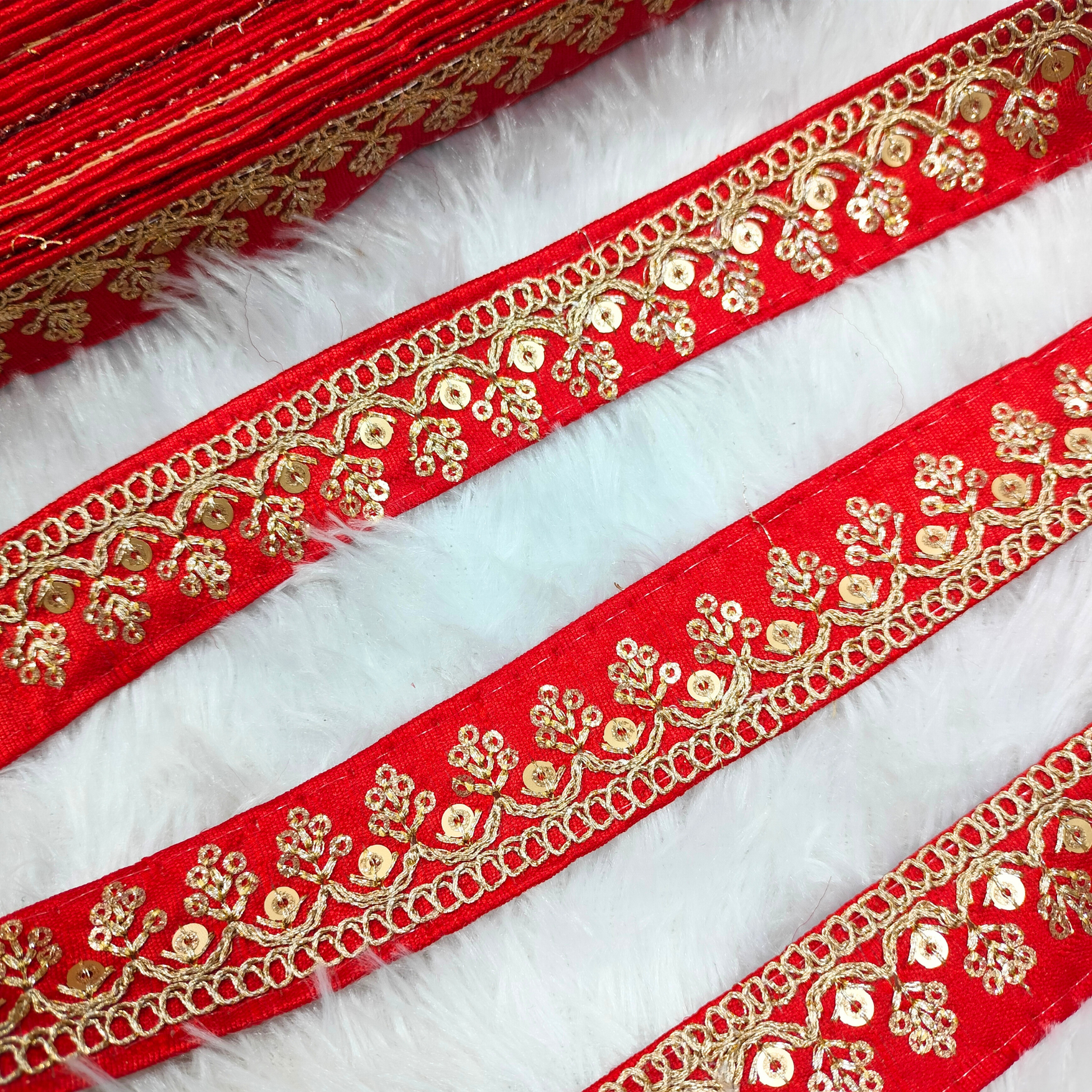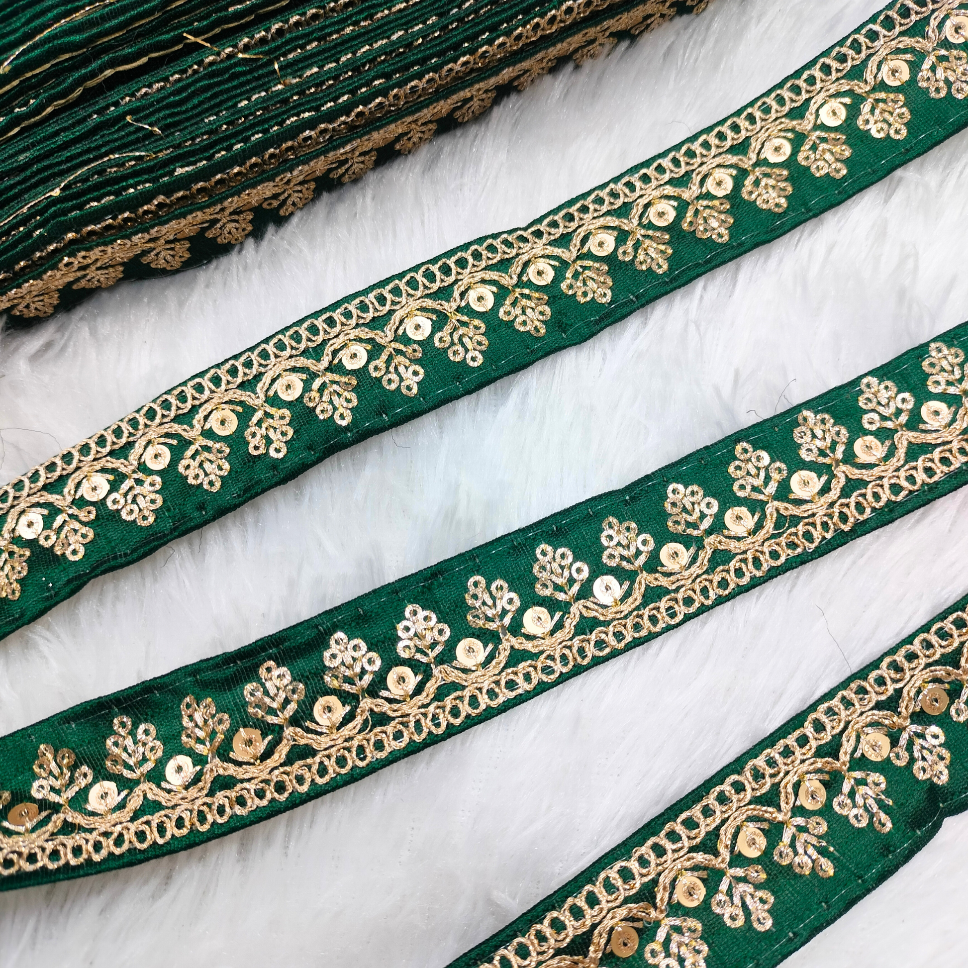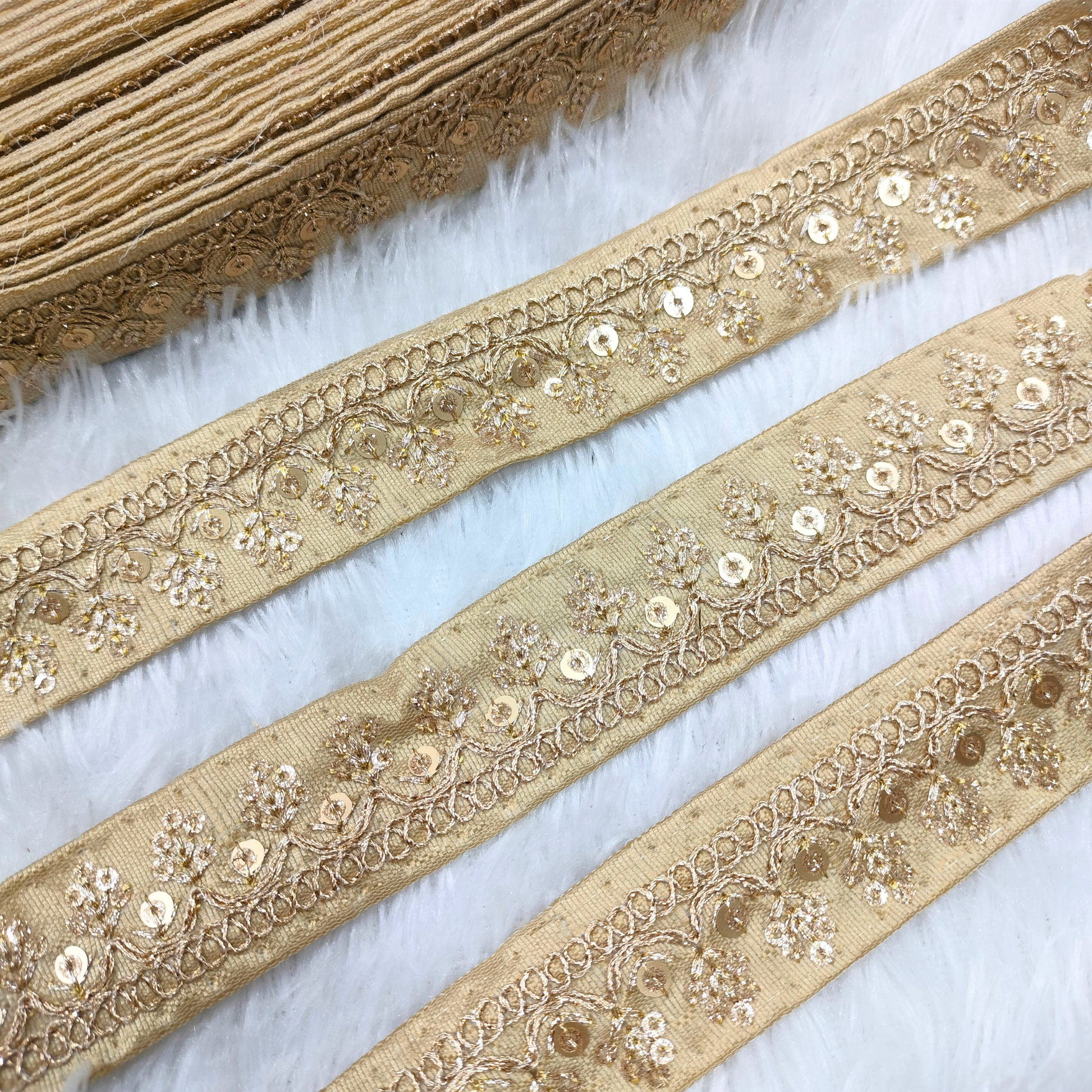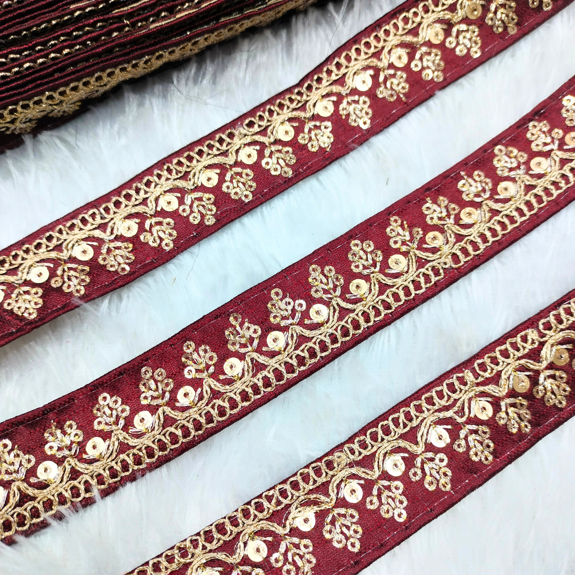 A finely made decorative trim featuring delicate vine motifs enriched with precise embroidery and sequins for a subtle gleam. The lightweight yet rich design is perfect for enhancing sarees, dupattas, lehengas, blouses, and festive home décor. Its detailed floral pattern adds classic elegance to both traditional and contemporary garments. Smooth to stitch and durable in finish, it gives every outfit a refined edge. A versatile embellishment that adds festive charm to a wide range of creative projects.