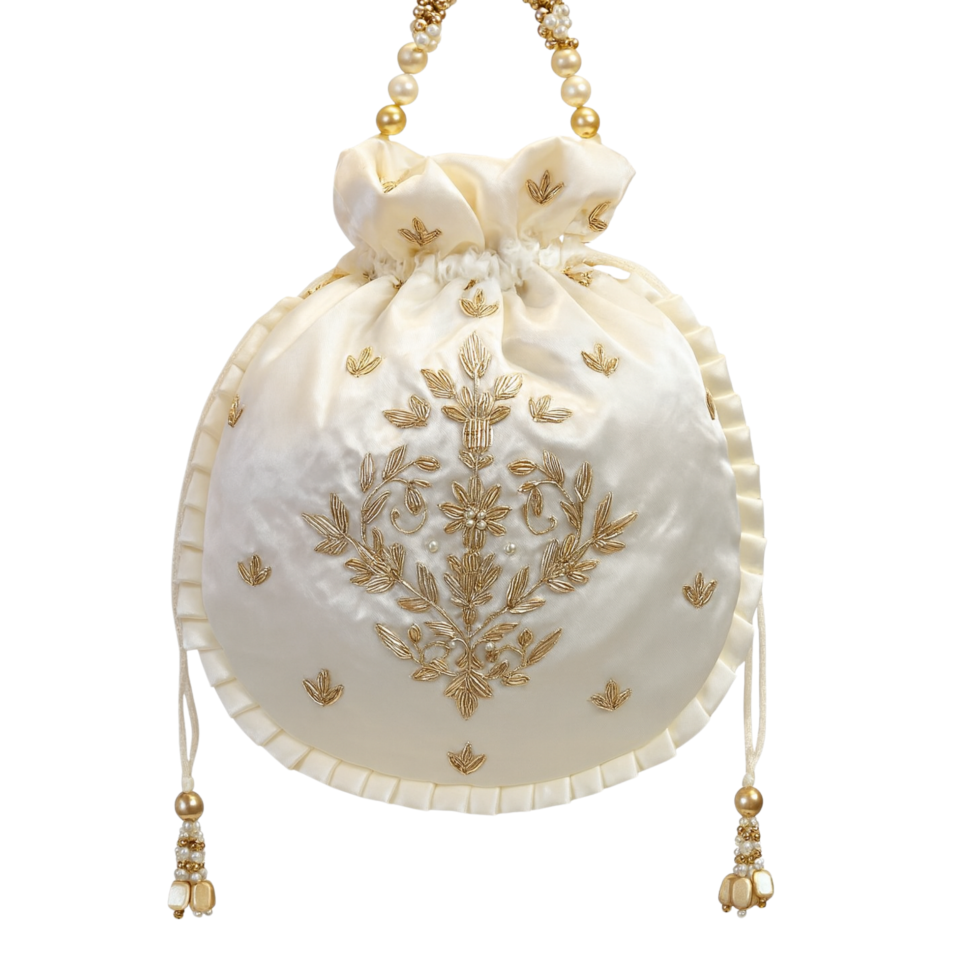 Classic and elegant, this ivory silk handcrafted potli features golden embroidery and pearl embellishments. Its sophisticated detailing makes it perfect for weddings, engagements, and festive wear. Lightweight yet luxurious, it complements both pastel and bold ethnic outfits. A timeless handcrafted designer potli bag. A wedding accessory every bride needs.