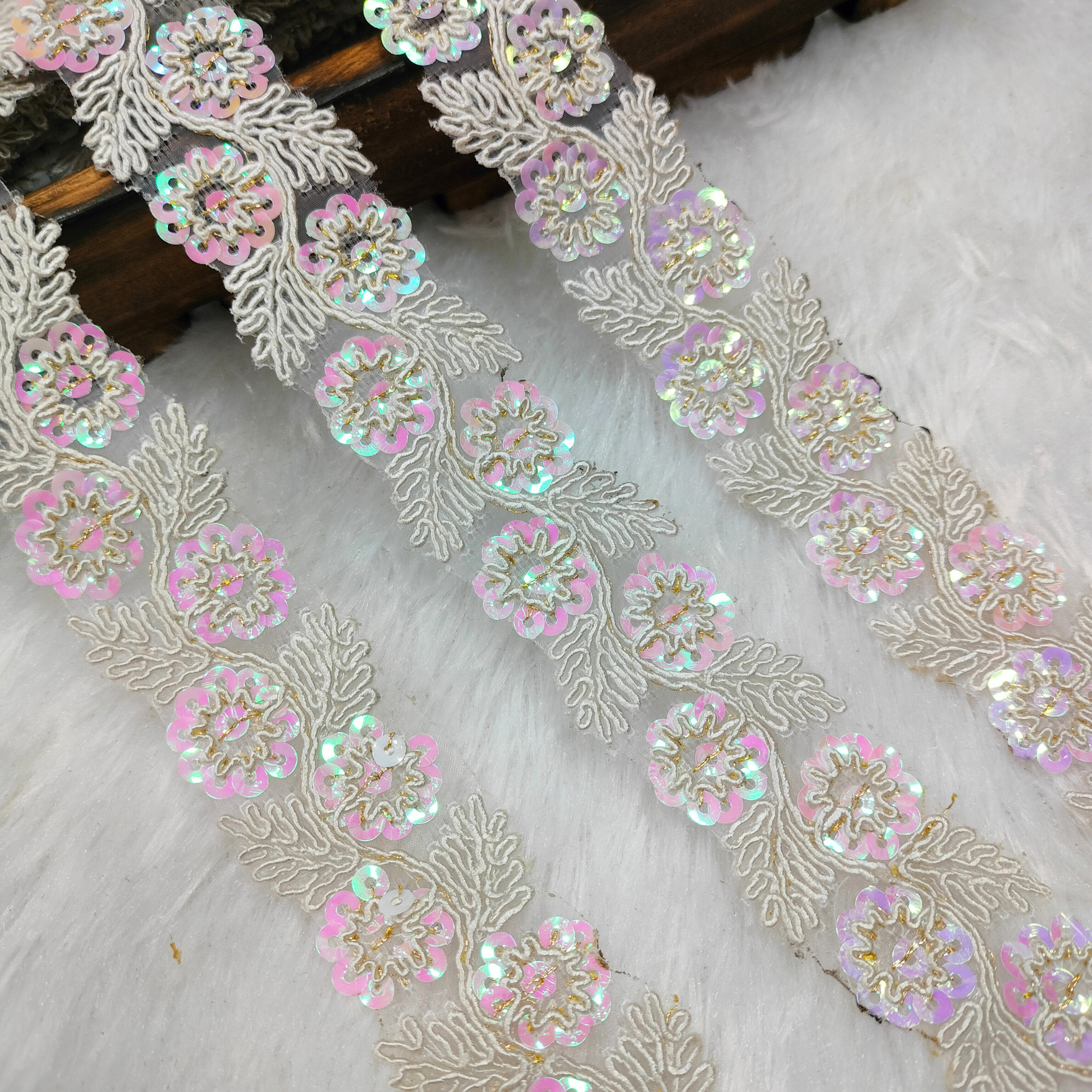 This ivory lace border is beautifully embroidered with floral motifs and enhanced using iridescent sequins that reflect subtle pastel hues. The soft base combined with gentle sparkle makes it perfect for bridal trousseau, pastel outfits, reception wear, and elegant festive designs.