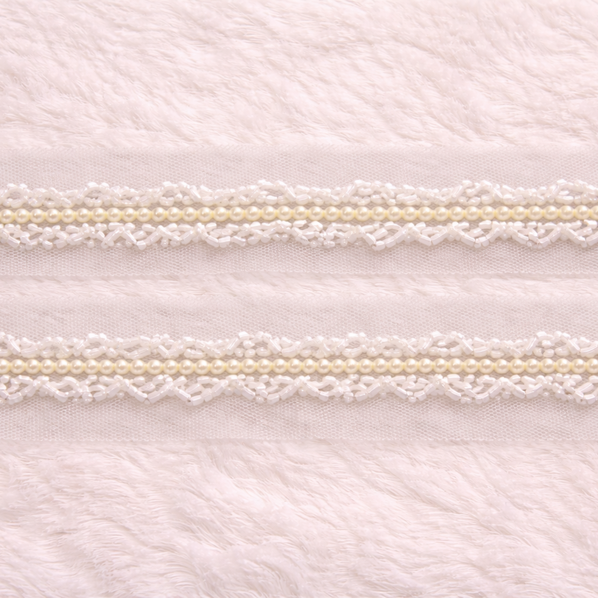 This lace is made on a soft net base and decorated with small ivory pearls and beads. The design is straight, clean, and very elegant. It gives a neat finish and does not look heavy, making it suitable for both simple and detailed outfits.
