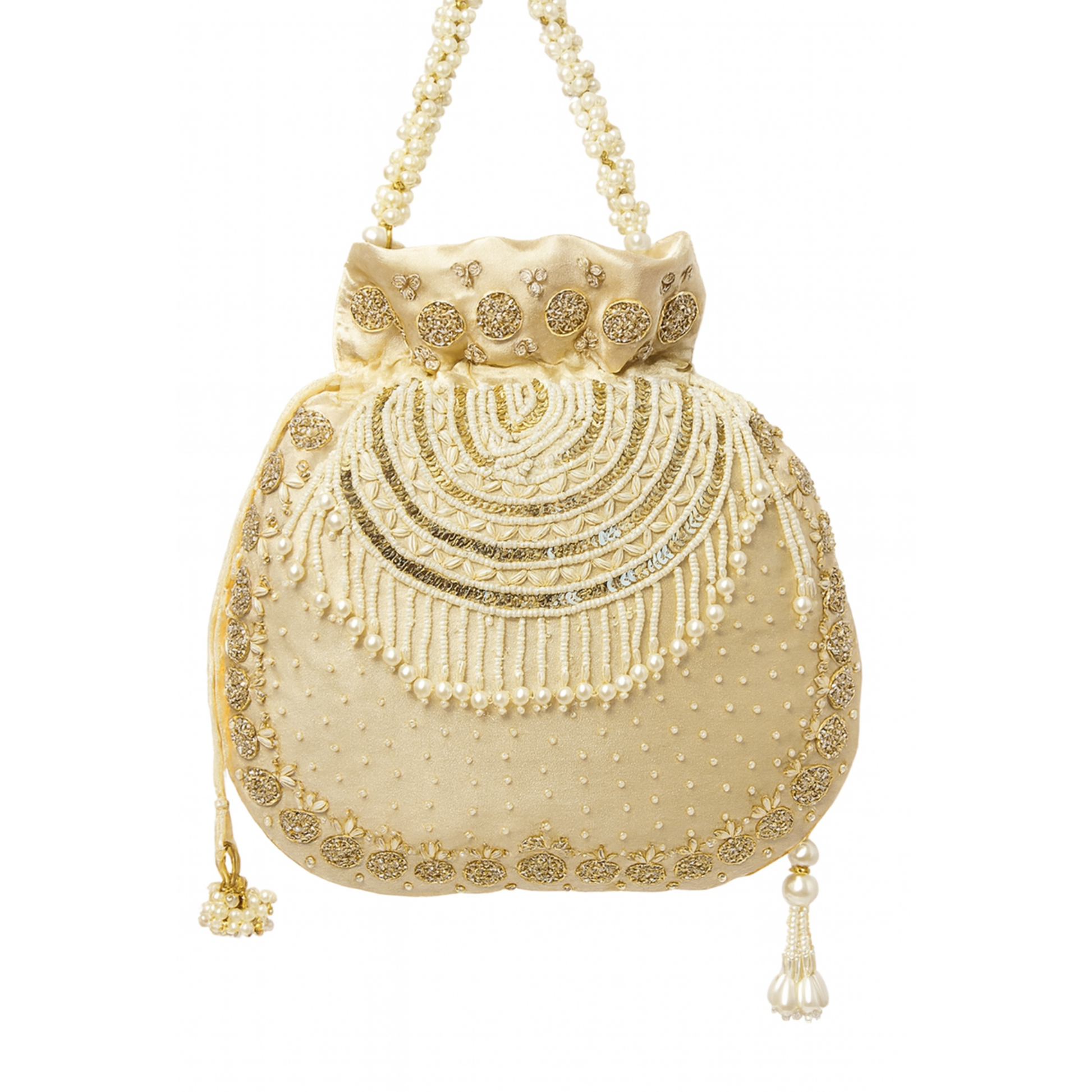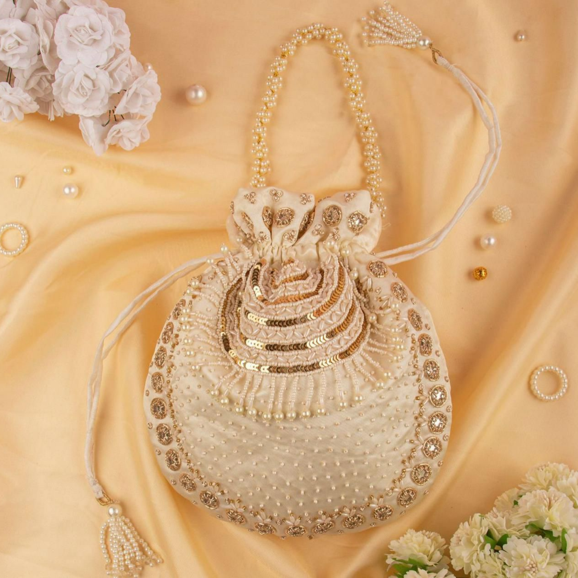 Crafted in ivory silk, this potli is beautifully decorated with intricate beadwork, sequins, and pearl hangings. The heavy embroidery in concentric designs makes it a statement piece. Perfect for brides and festive functions, this potli brings elegance and versatility to your ethnic wardrobe.